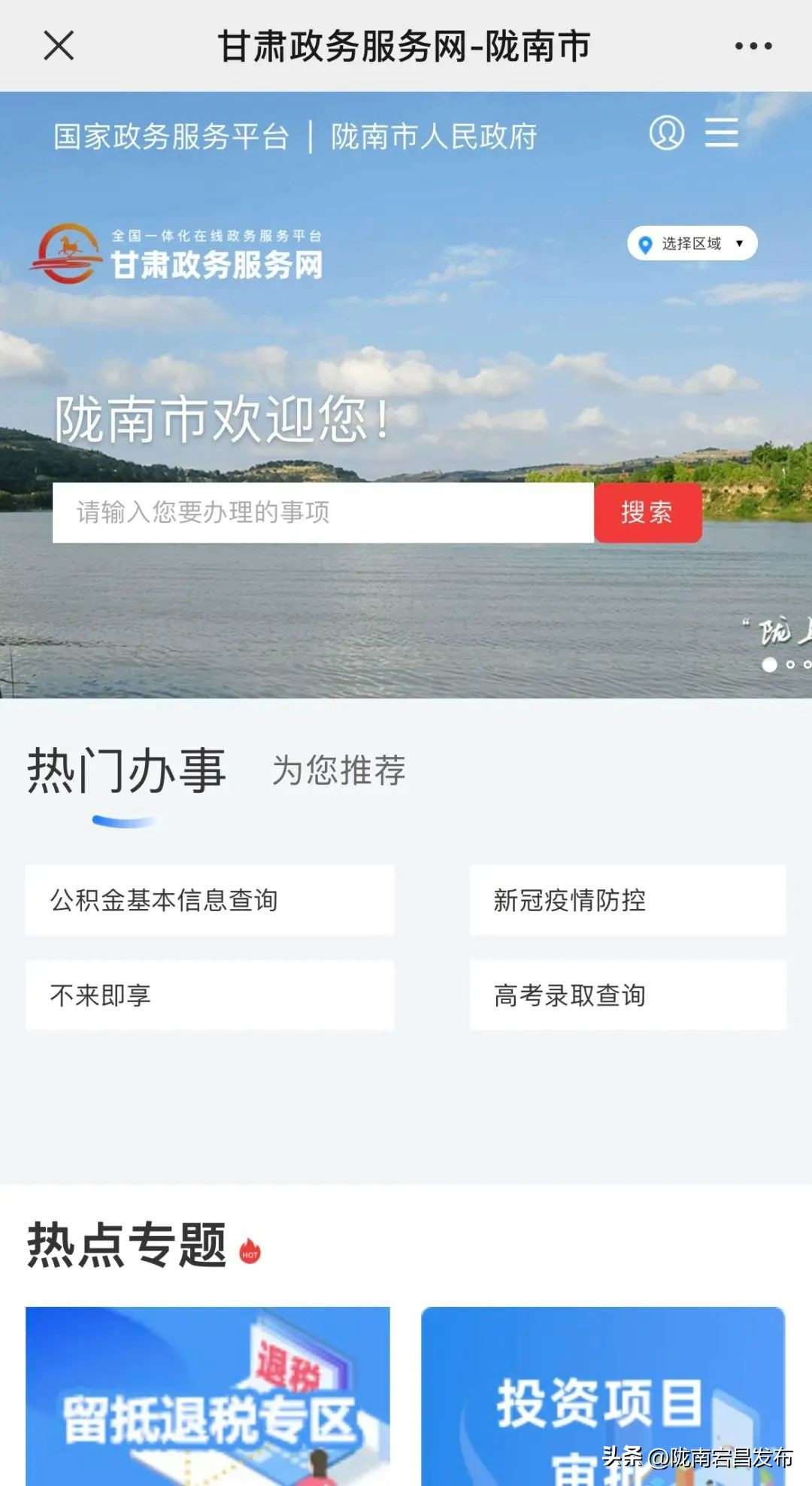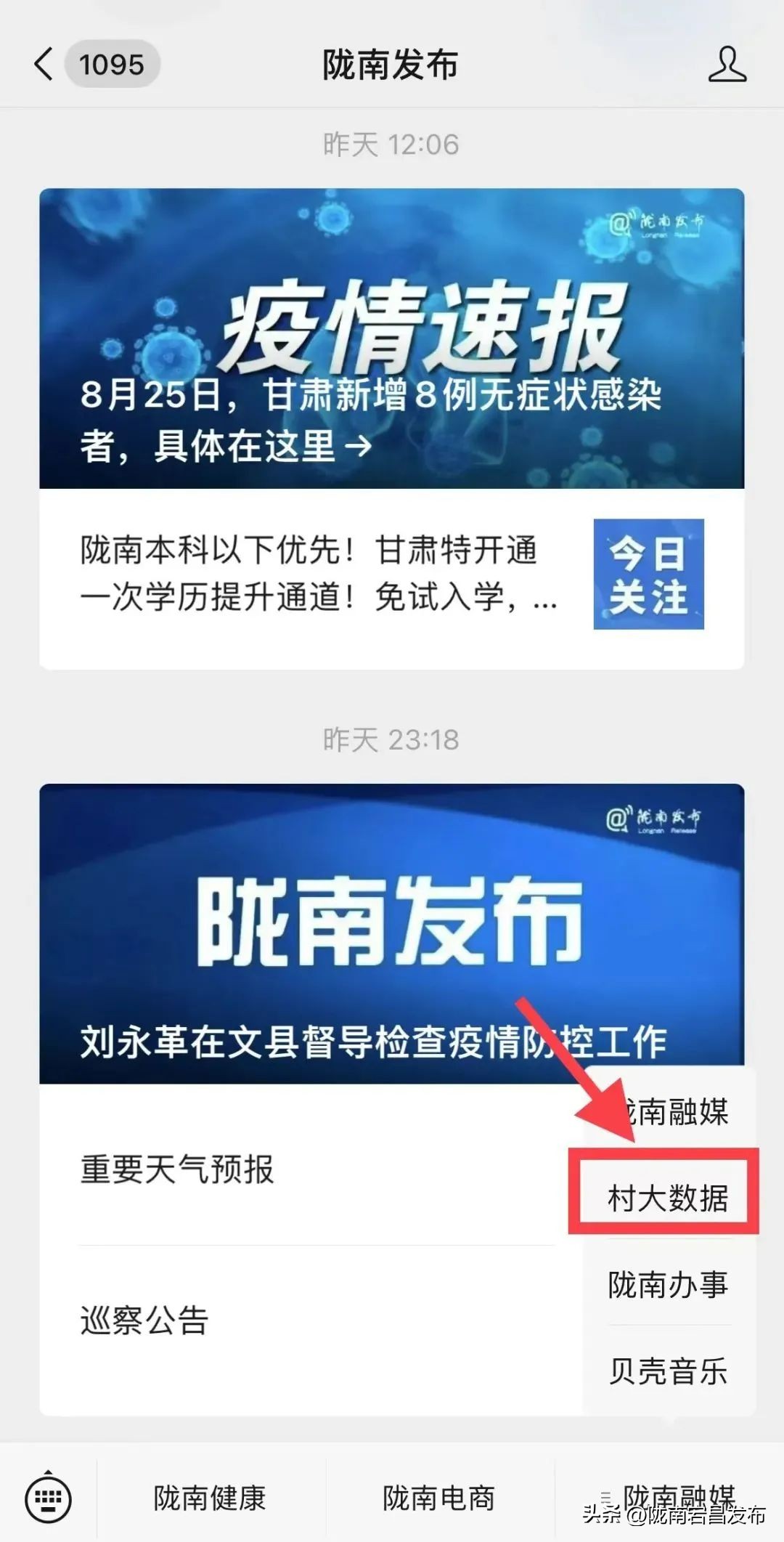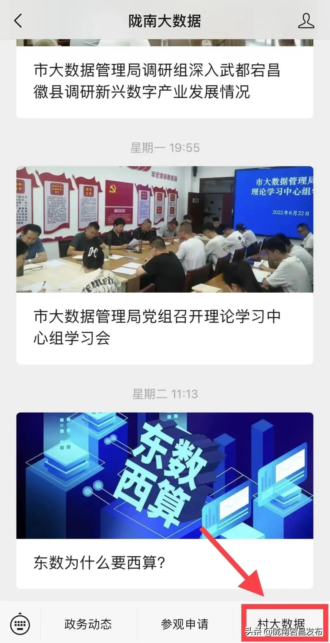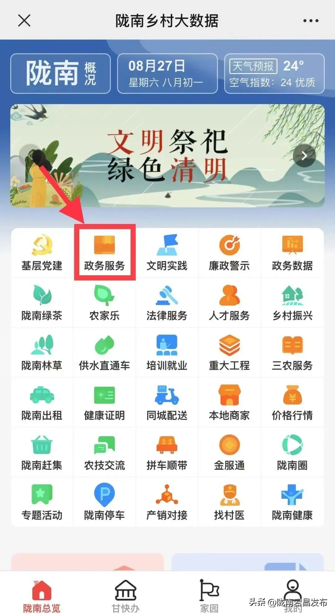 關注微信公眾號“隴南發布”或“隴南大數據”,點擊菜單欄右下角“村大數據”,進入隴南鄉村大數據平臺,點擊“政務服務”板塊,跳轉至甘肅政務服務網。