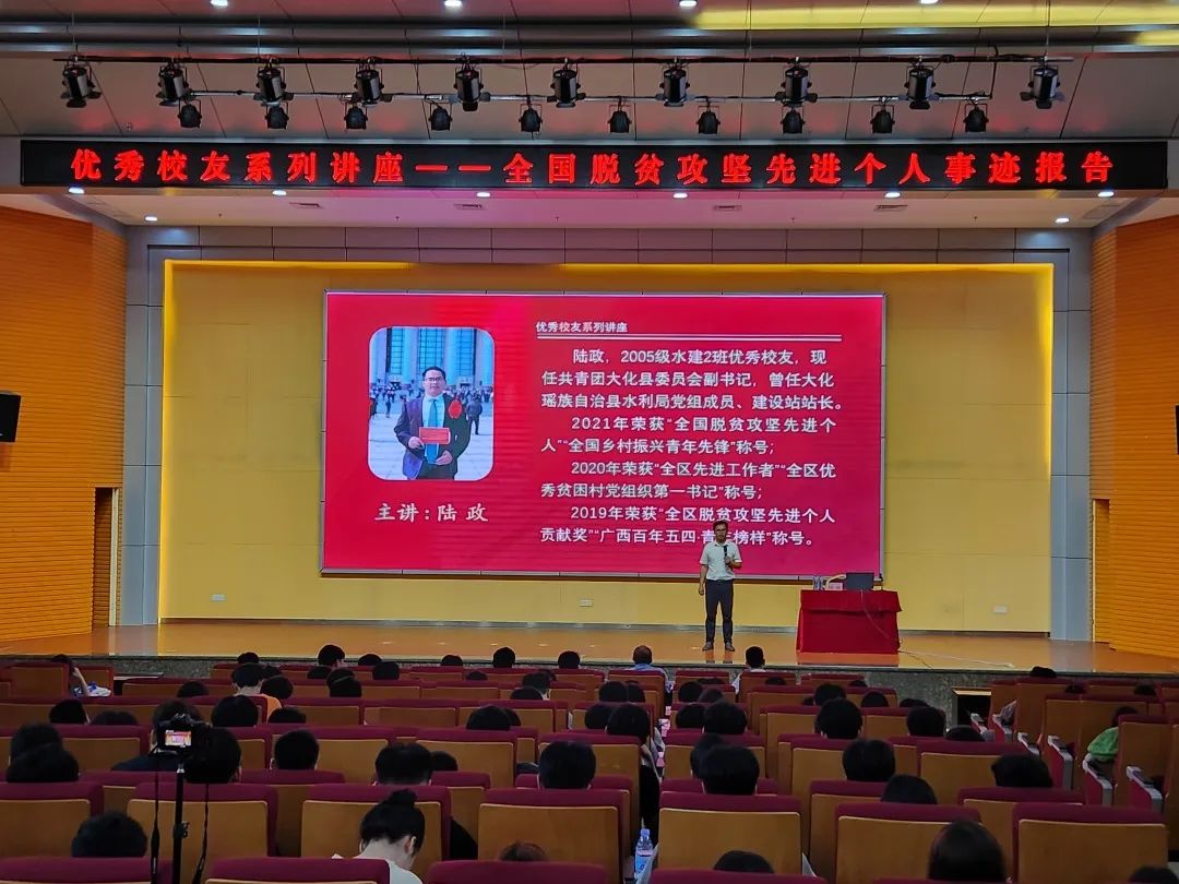 水利工程學院邀請優秀校友陸政到里建校區青年之家學術報告廳為在校學生開展題為《全國脫貧攻堅先進個人事跡報告》的講座。