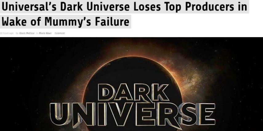 環球黑暗宇宙2017年,環球影業宣布將打造“黑暗宇宙”,只不過這個系列電影在一部湯姆克魯斯《新木乃伊》之后就“流產”了,可以說是最慘的電影宇宙了。