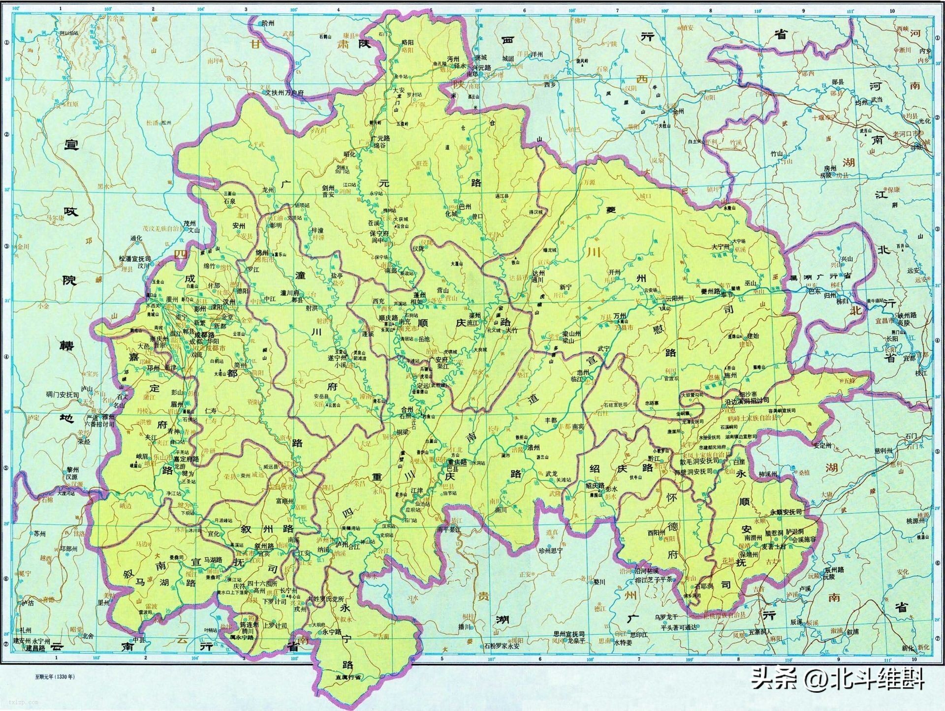 而元朝滅亡南宋后,就在各大路之上又設置了行省。行省的幅員遠遠超過了過去的路,一個省要管轄過去的多路。當時的巴蜀四路被合并設置了“四川行省”。這是歷史上巴蜀真正首次實現了區劃合并。“四川”也正式成為了區劃名字。