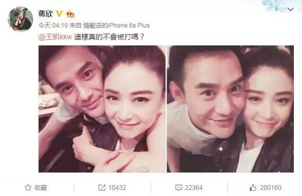她和王凱多次合作,在微博上親密互動,引發不少猜想,但最后證實只是好朋友開玩笑而已。