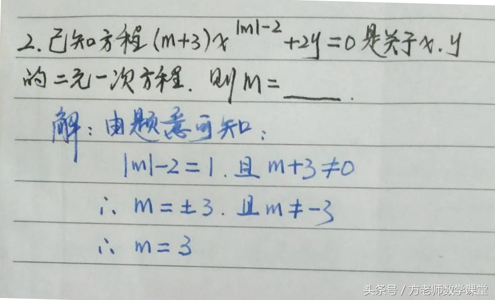 2,同樣,按照二元一次方程定義的四個條件來判定。含有兩個未知數,未知數的次數都是1,未知數系數不等于0,所以只需要滿足的條件是:|m|-2=1,且m+3≠0,解得m=3,就是此題的答案。