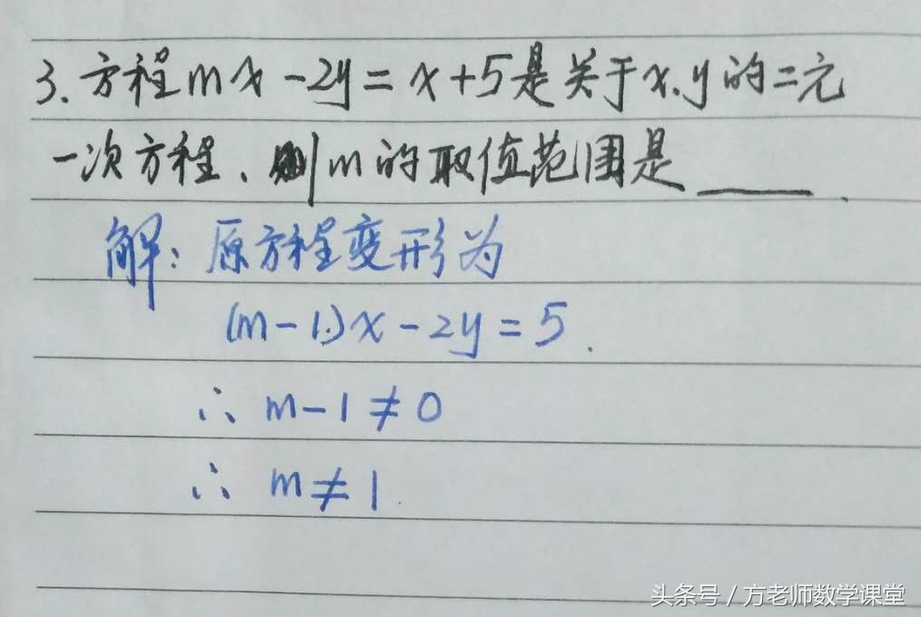 3、此題比前面兩題多了一個步驟,多了一個合并同類項的步驟。判定一個等式是方程,是看合并同類項之后的結果,還是否滿足方程的條件。所以,原方程通過移項合并同類項,變形成(m-1)x-2y=5。再依據滿足四個條件的依據,得到系數m-1≠0,所以m的取值范圍是m≠1。