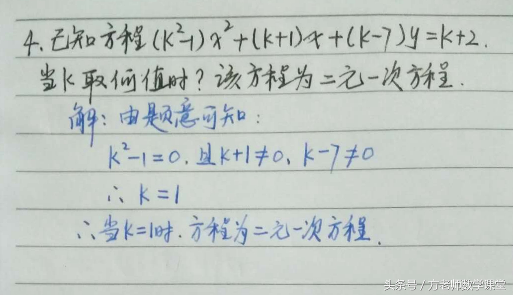 4、按照二元一次方程的四個滿足條件來判定,那么x的2次項必須不存在,也就是此項的值為0,則系數等于0。x的1次項,y的1次項必須存在,則系數必須不等于0。所以,k2-1=0,且k+1≠0,k-7≠0。所以,k=1。