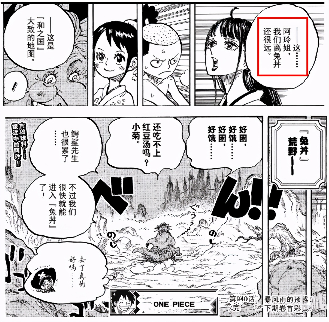 1. 大媽登陸和之國后失憶,清晨時間在撿漏鎮與喬巴等人乘坐鱷鯊前往兔丼的工廠;