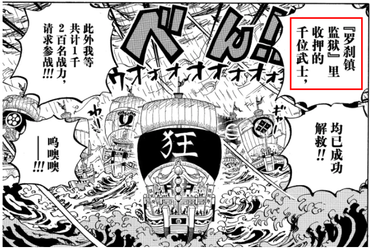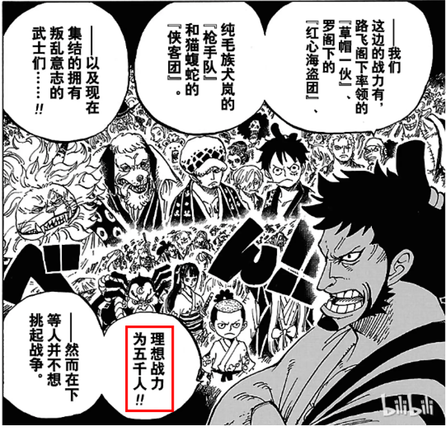 而在鬼之島大戰當天計數參與的武士也是4500人。(3500人來自被路飛解救的兔丼工廠,1000人來自被狂死郎解救的花之都羅剎鎮的監獄)