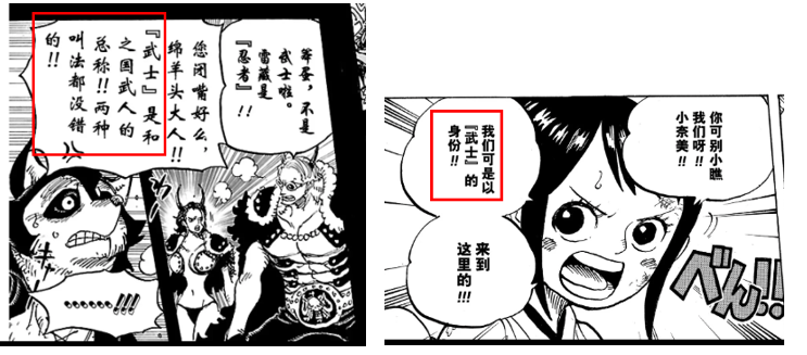 那我們看看尾田在漫畫中對忍者的定位是什么。在下圖中,無論是原御庭番眾的雷藏,還是新入門的“妖艷女忍者”阿玉都被定位為“武士”。