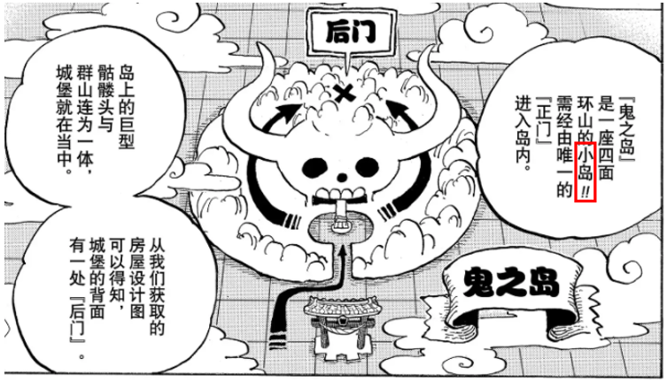 不管這些,我們姑且把骷顱頭的直徑定為600米,那么鬼之島的半徑約等于骷顱頭的直徑。使用圓面積公式S=πr2,計算得出鬼之島面積1.13平方公里。與和之國主島4444平方公里比起來,不值一提。