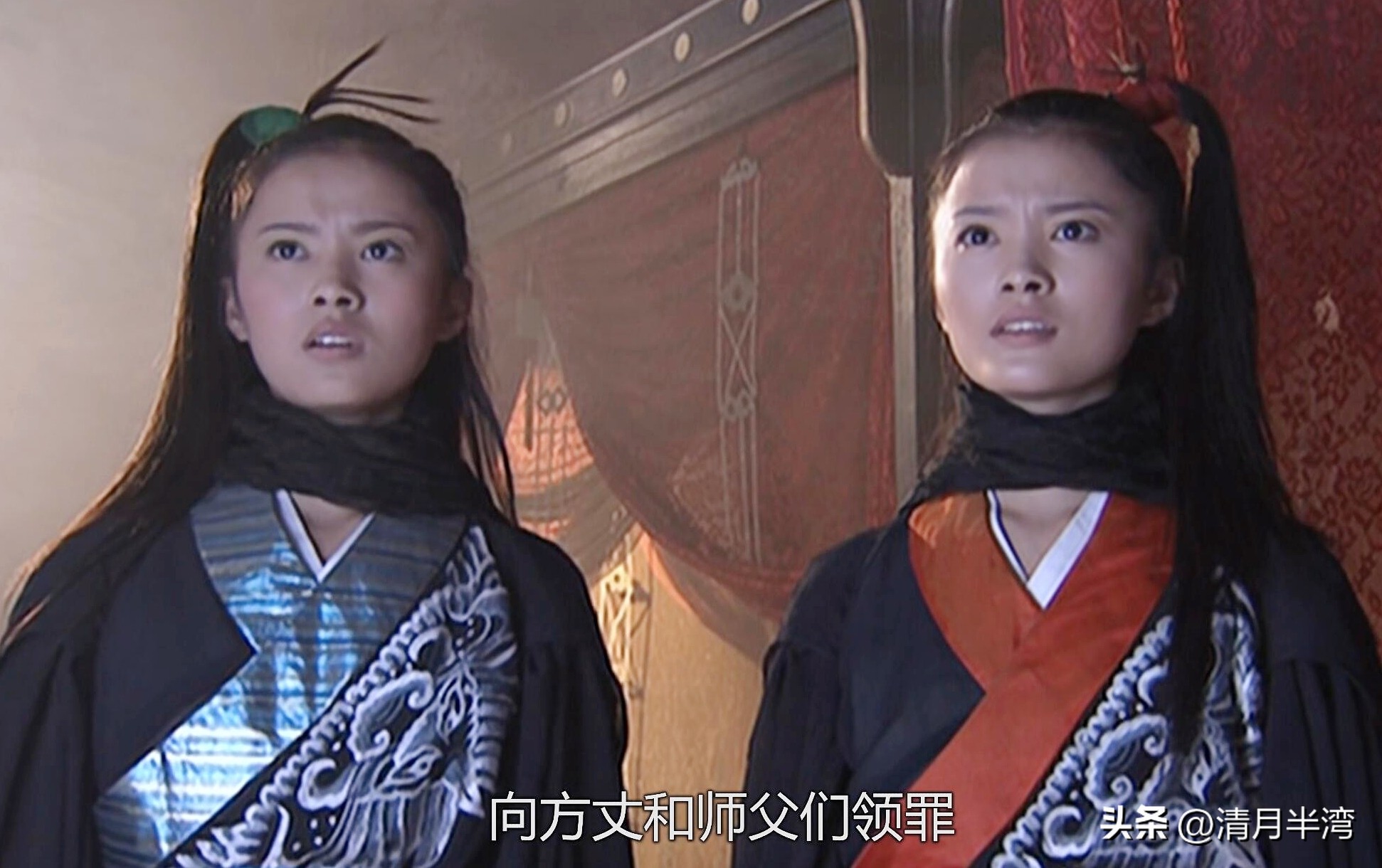 書里靈鷲宮有梅蘭竹菊四大婢女,這版劇組沒找到四胞胎,找了周冰清、周玉潔雙生姐妹花來演梅劍和竹劍。