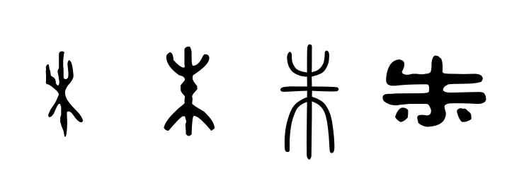 “朱”字在“木”子的主干部位加指事符號,表示樹木的主干部分。