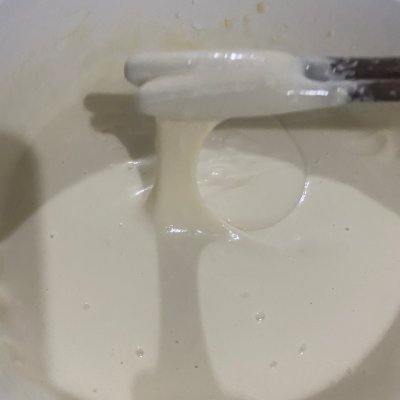 6、一直到面糊中沒有顆粒,攪拌到稍有阻力感,用筷子挑起可以掛筷子為宜,不要攪的太干或者太稀。