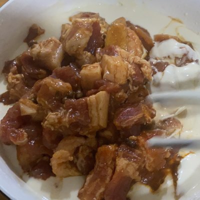 7、腌制好的肉倒入調好的面糊。挑出蔥和姜片。
