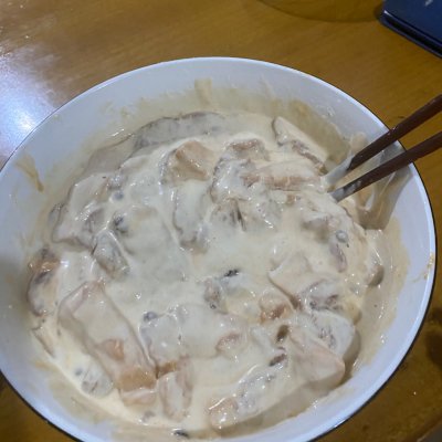 8、攪拌均勻,讓每一塊肉都分開裹上面糊。