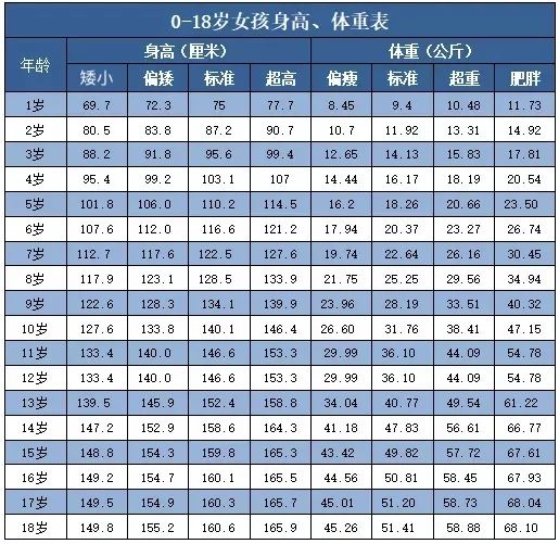 0-18 歲女孩身高體重對照表: