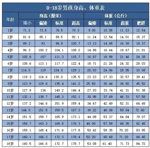 0-18 歲男孩身高體重對照表: