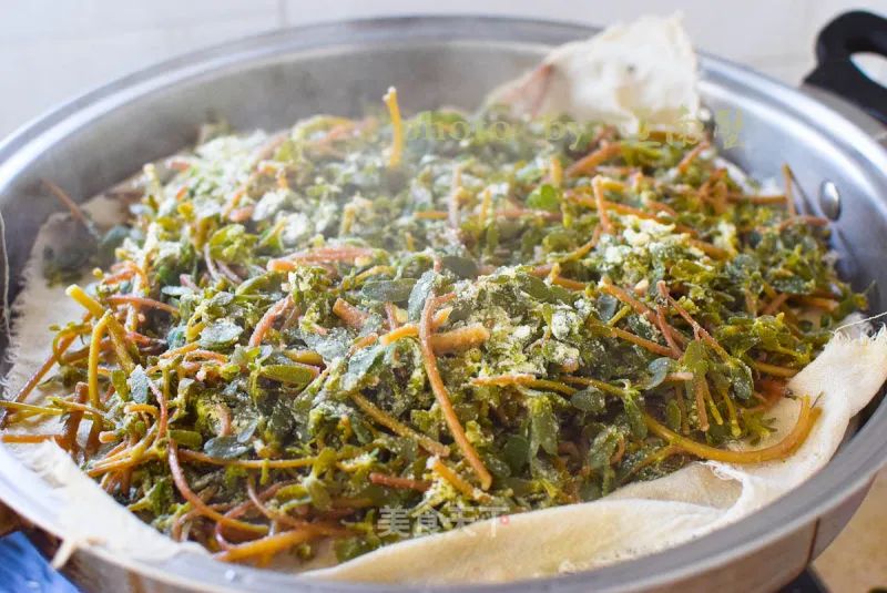 5. 將拌好的蔬菜均勻的鋪在籠布上面,水開后上籠,大火蒸五分鐘,關火馬上開鍋,將蒸好的菜鋪在案板上面散汽,這一步也非常關健,散汽后的蒸菜才會松散,餐館里為了快速上菜,會備風扇幫助散汽,散掉的“汽”其實也是水份。