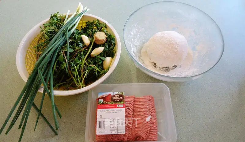 1. 準備食材:豬肉碎、馬齒莧、姜、蒜、蔥、面團。