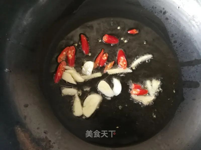 7. 鍋內適量油燒熱,姜蒜,小米椒炒香。
