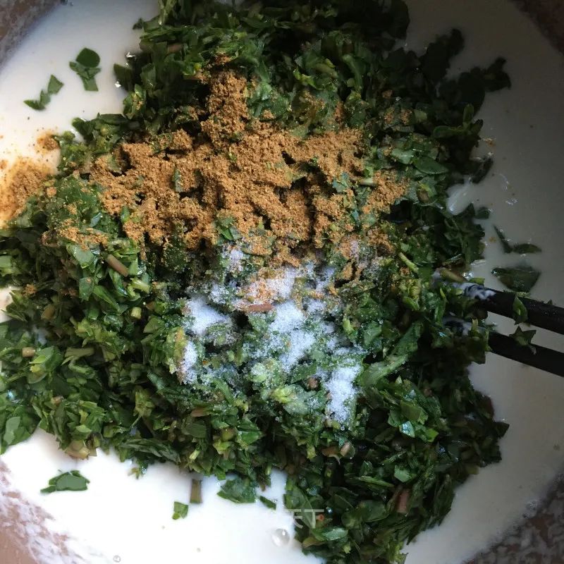 4. 切碎后的馬齒莧放入面糊中,加鹽和五香粉攪拌均勻,稠度能上筷子即可。