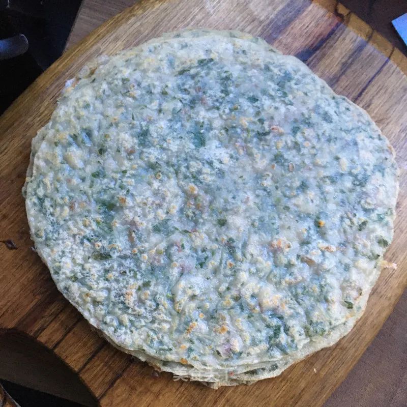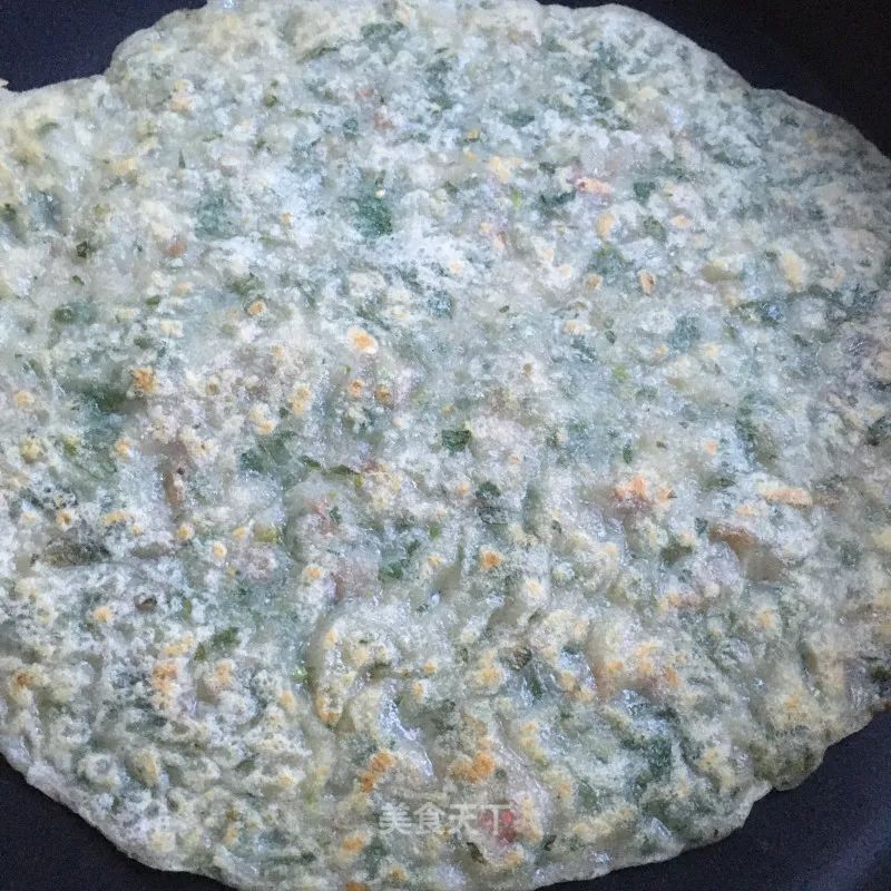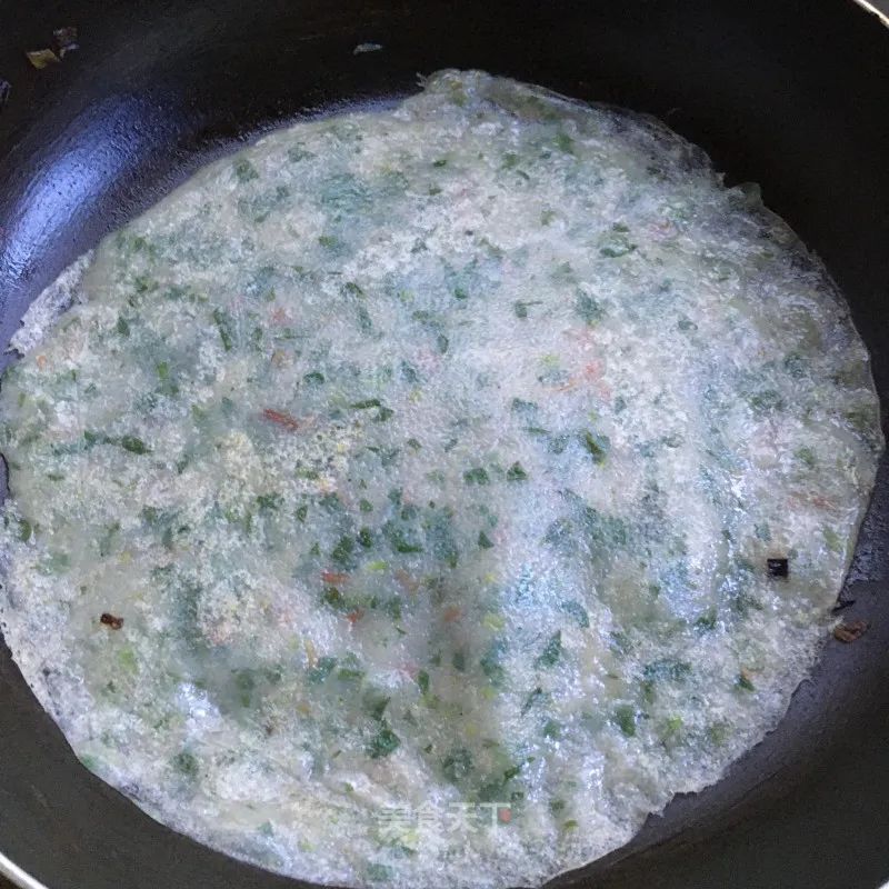 5. 平底鍋抹油放入一勺馬齒莧面糊,轉動過鍋使其均勻攤平。
