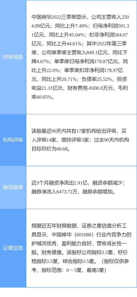 2022年12月19日,開源證券研究員張緒成,薛磊發布了對中國神華的研報《公司信息更新報告:現金低價收購錦界能源30%股權,盈利提升再凸顯》,該研報對中國神華給出“買入”評級。研報中預計2022-2024年歸母凈利潤分別為743.3/766.5/788.3億元,同比+47.9%/3.1%/2.8%;EPS為3.74/3.86/3.97元,對應當前股價PE為7.6/7.4/7.2倍。維持“買入”評級。證券之星數據中心根據近三年發布的研報數據計算,該研報作者對此股的盈利預測準確度為90.17%。
