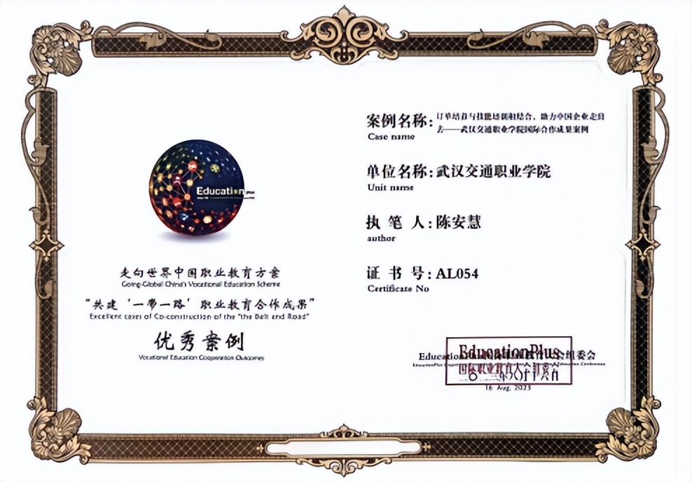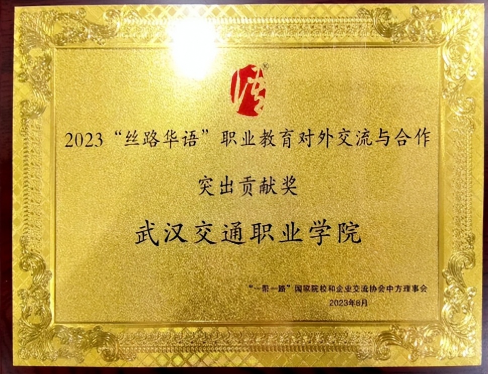 在2023 Education Plus(第七屆)中國(長沙)國際職業教育大會暨產教融合博覽會上,武漢交通職業學院榮獲2023“絲路華語”職業教育對外交流與合作突出貢獻獎、走向世界中國職業教育方案“共建‘一帶一路’職業教育合作成果”優秀案例獎。