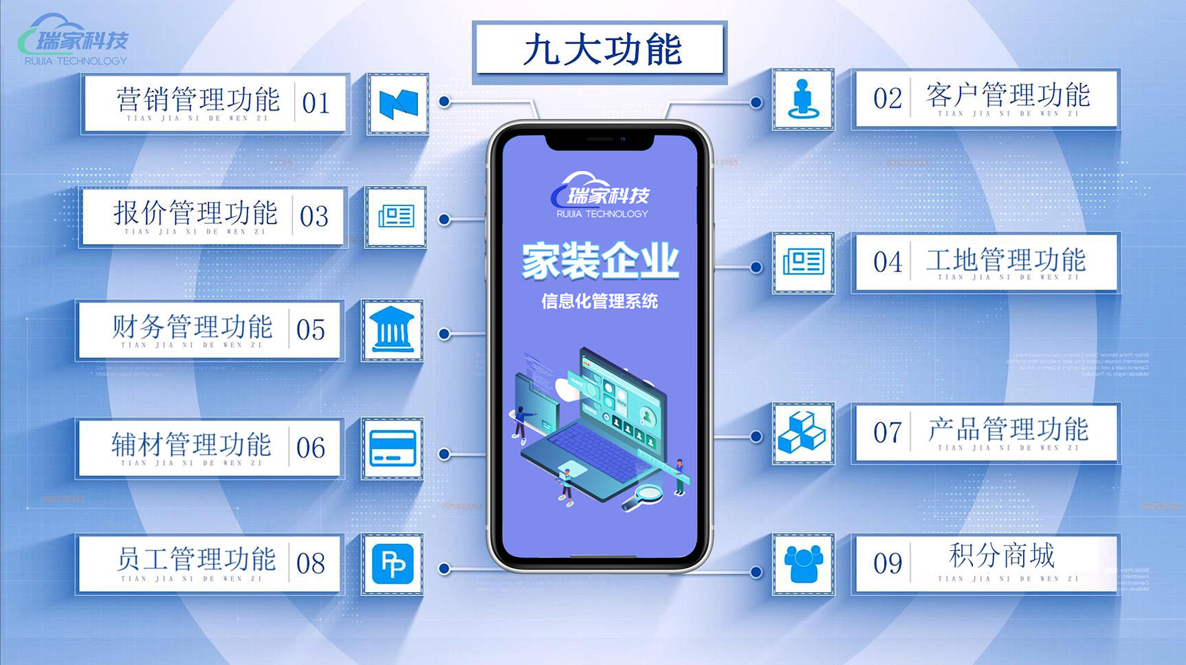 瑞家裝企云管理系統九大功能板塊覆蓋家裝裝修全流程業務鏈,分別是營銷獲客功能、CRM系統/客戶管理功能、工地管家、預算報價管理、財務管理、ERP產品/輔材管理、OA辦公/員工管理、可視化報表、家居建材積分商城等。