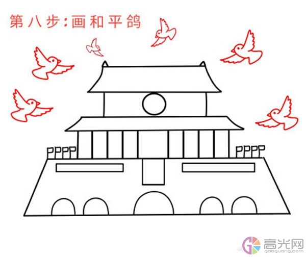 8、等拱門畫好之后,在天安門的頂部畫上一些正在飛翔的和平鴿, 這里我們可以根據自己的喜好來調整和平鴿的造型和飛行方向。