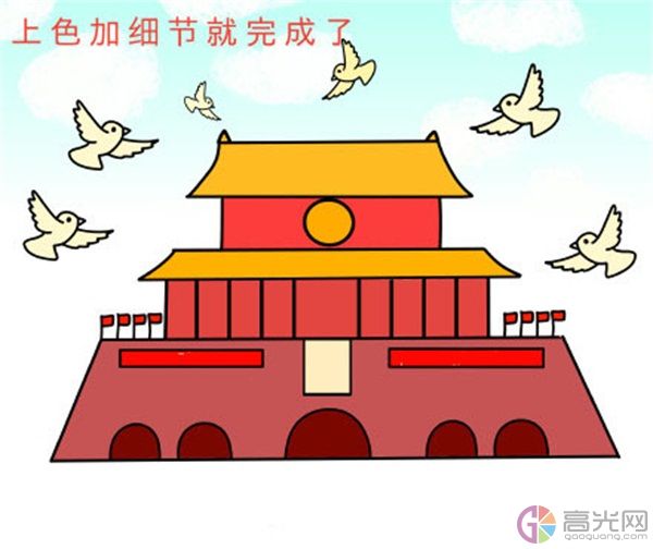 9、最后給天安門、和平鴿上色并在畫紙頂部涂上天空的顏色、畫上幾朵白云,這樣一幅簡單、好看的天安門簡筆畫就完成了。