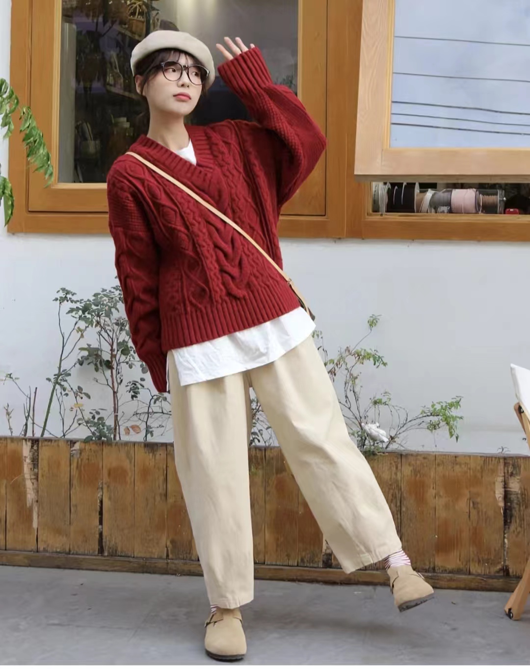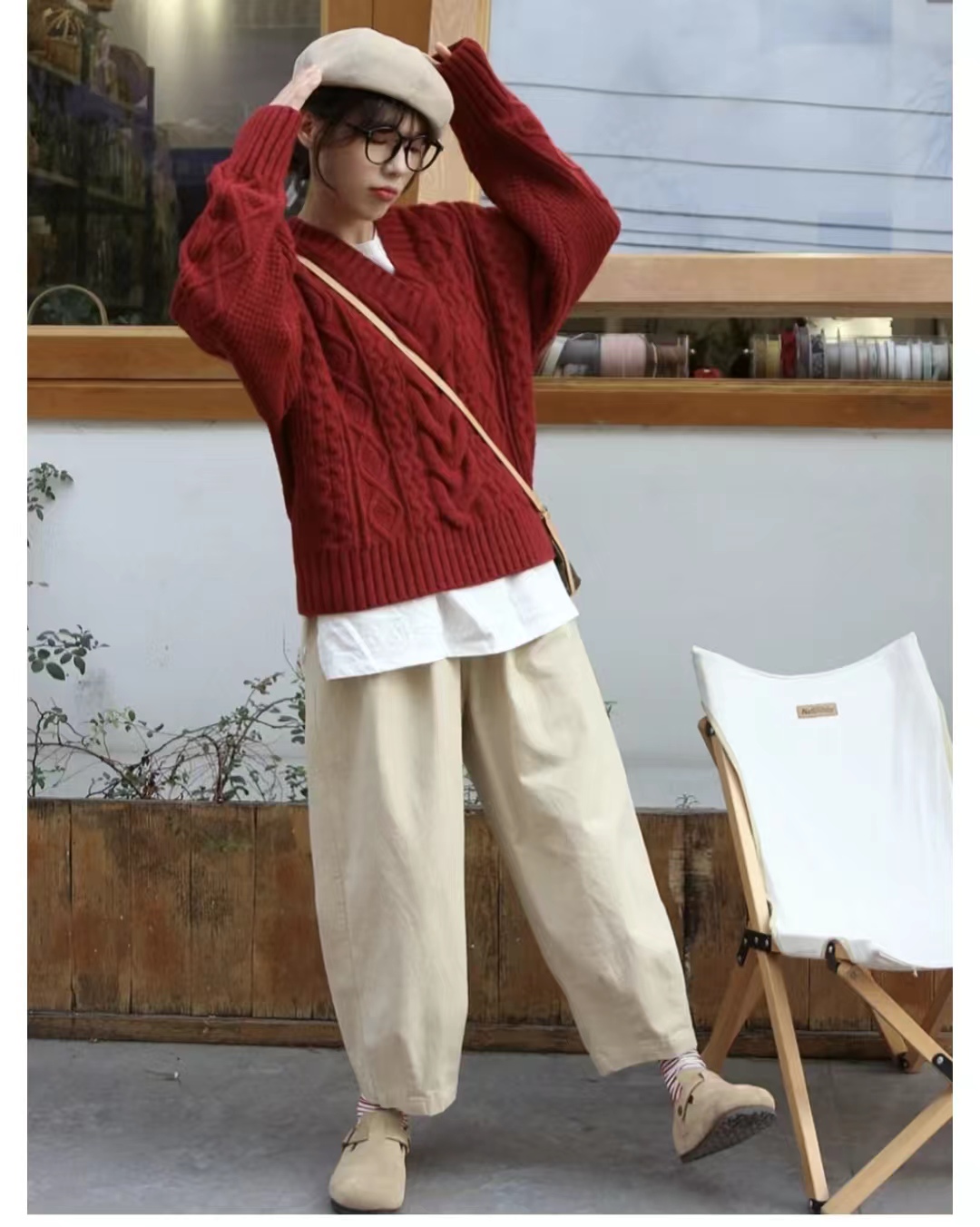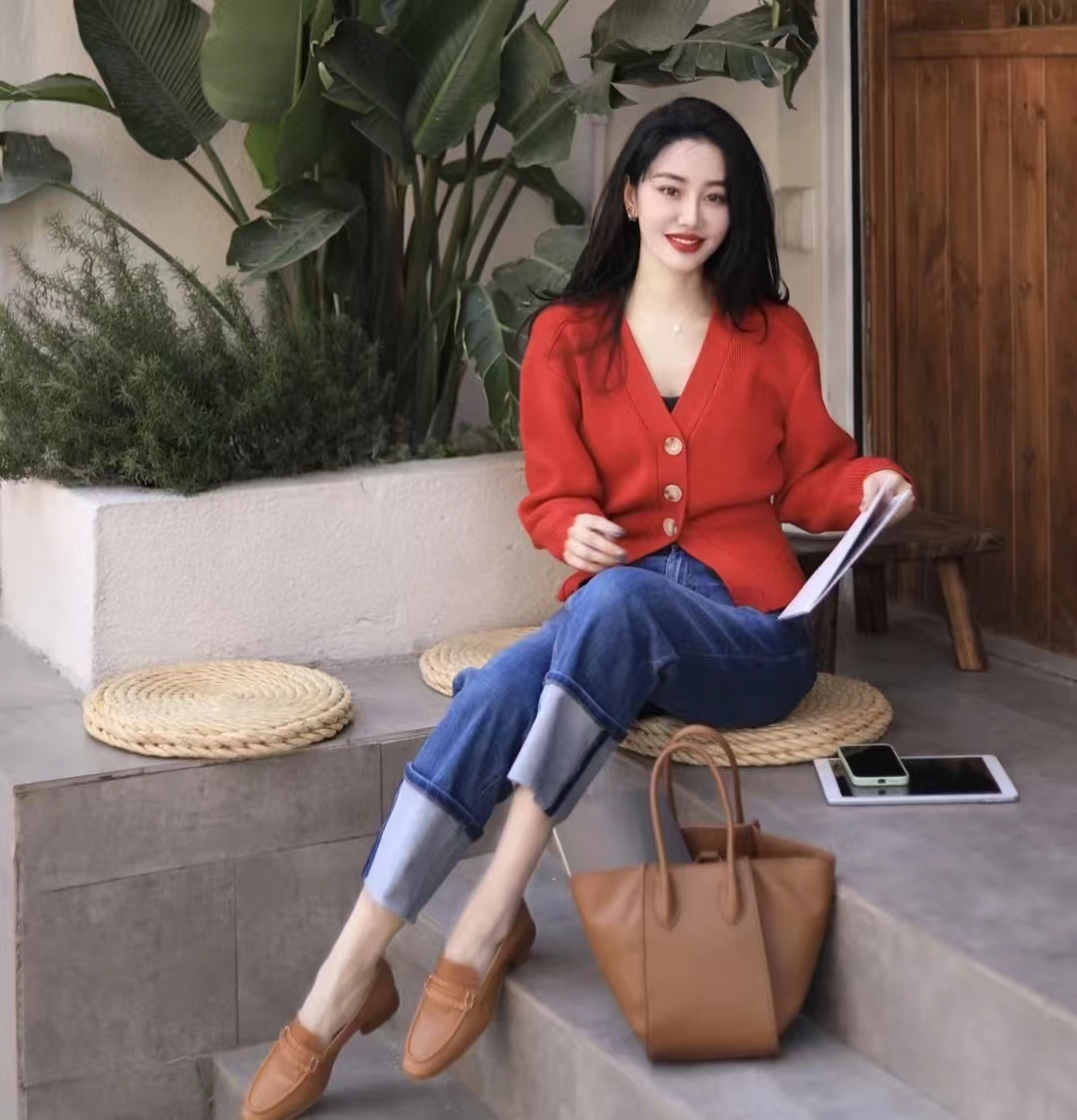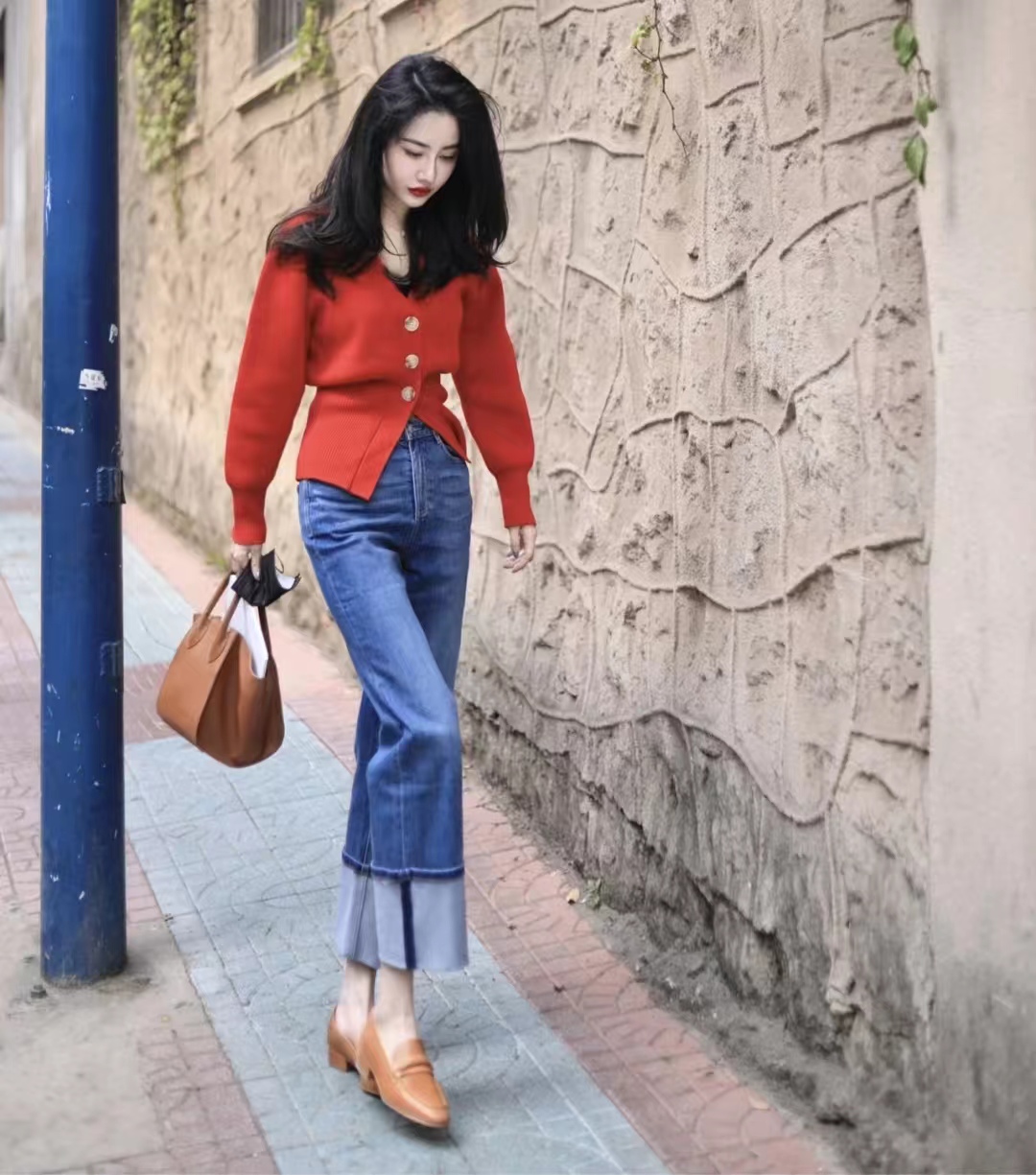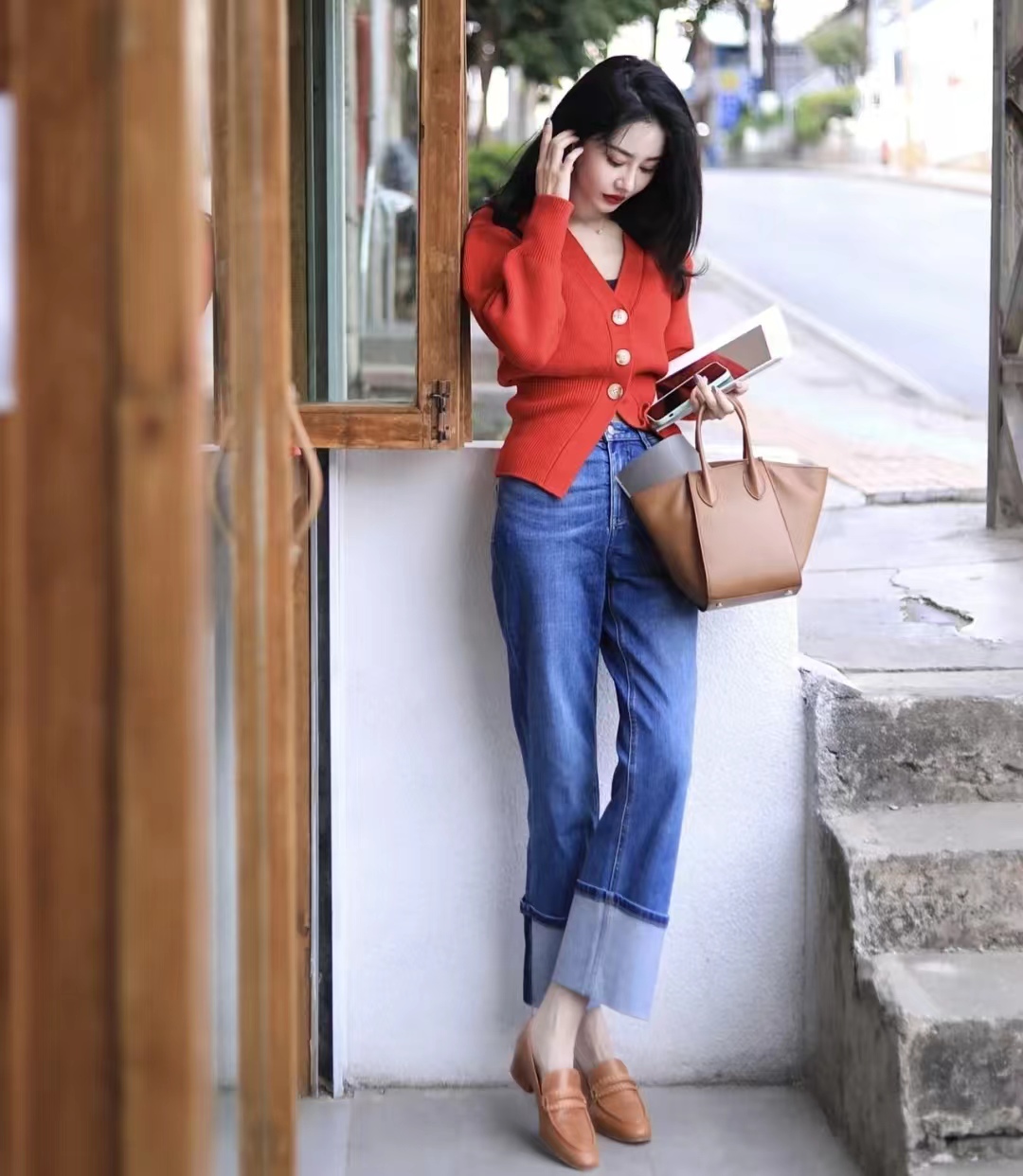 紅色針織衫日常單穿/疊穿/做披肩都可,收腰下擺微開的設計,既顯腰身又能視覺提升腰線,絕對是顯瘦又顯高的單品;搭配復古藍直筒牛仔褲+棕色樂福鞋,顯高顯瘦顯腿長?