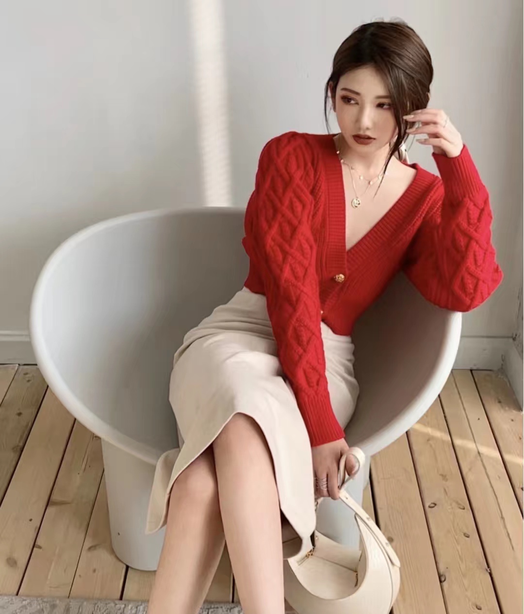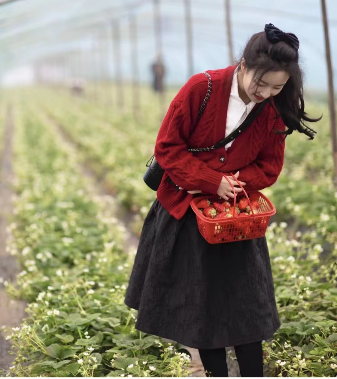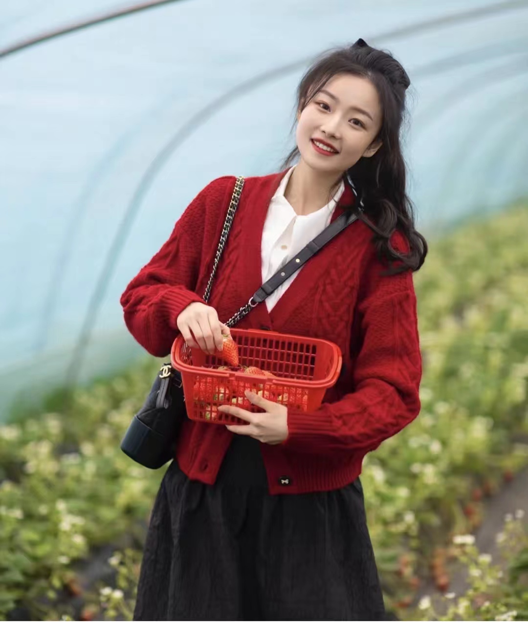 紅色開衫喜氣洋洋的,內搭白色襯衫+黑色半身裙,怎么感覺文靜又俏皮,這套還挺適合過年見長輩的,北方的姐妹們可以搭配一件黑色的羽絨外套兼顧保暖?