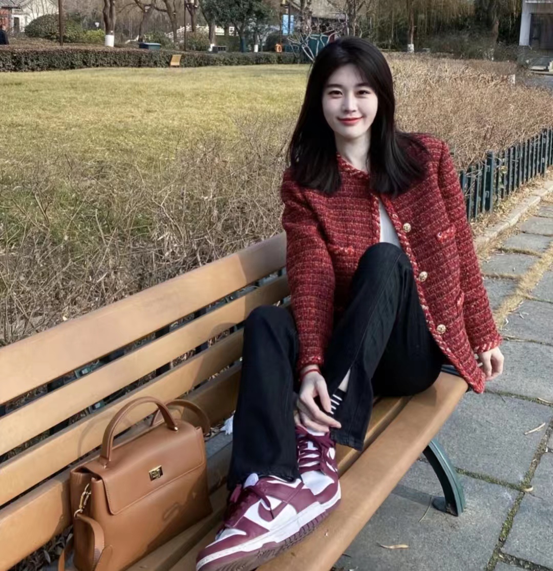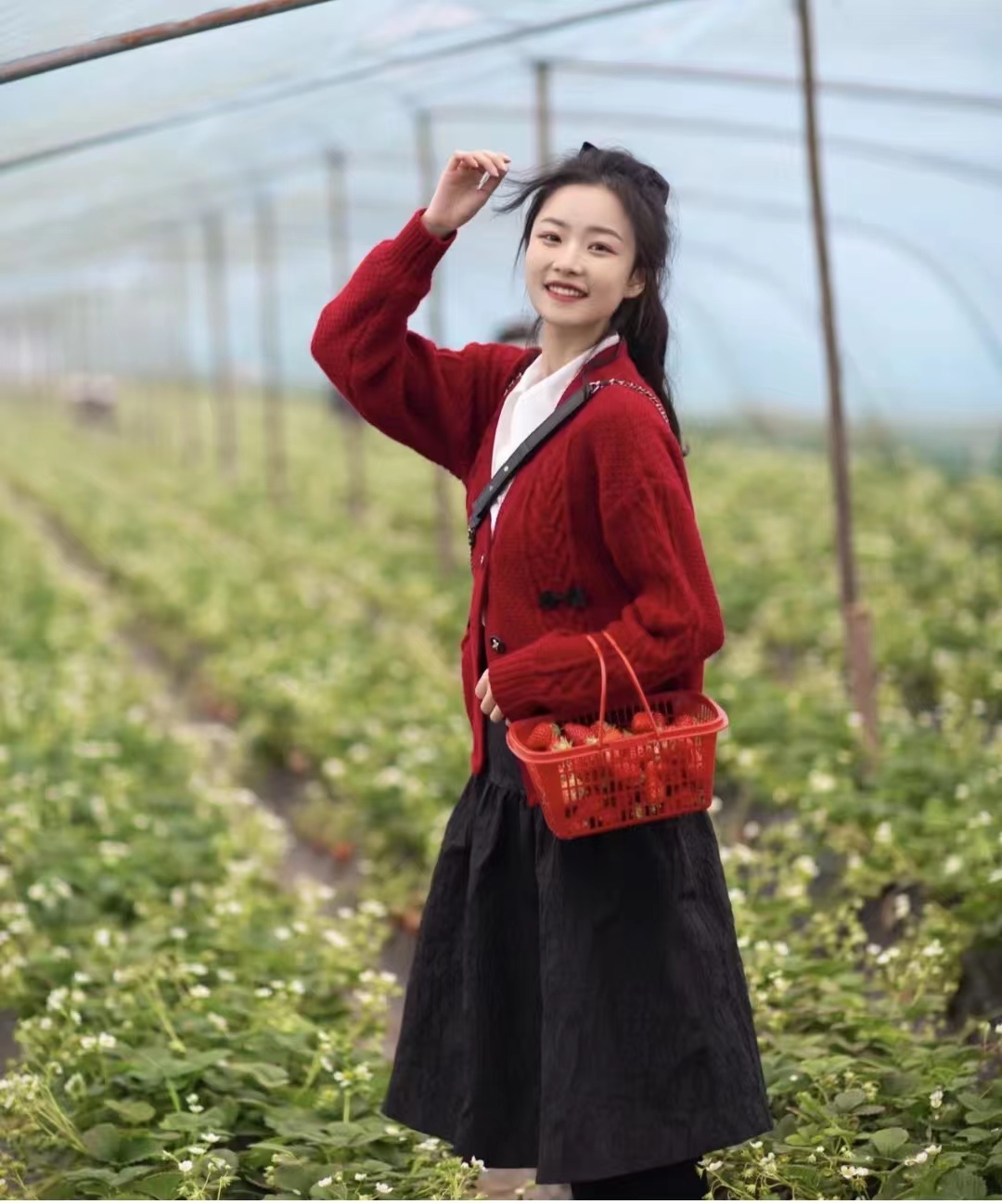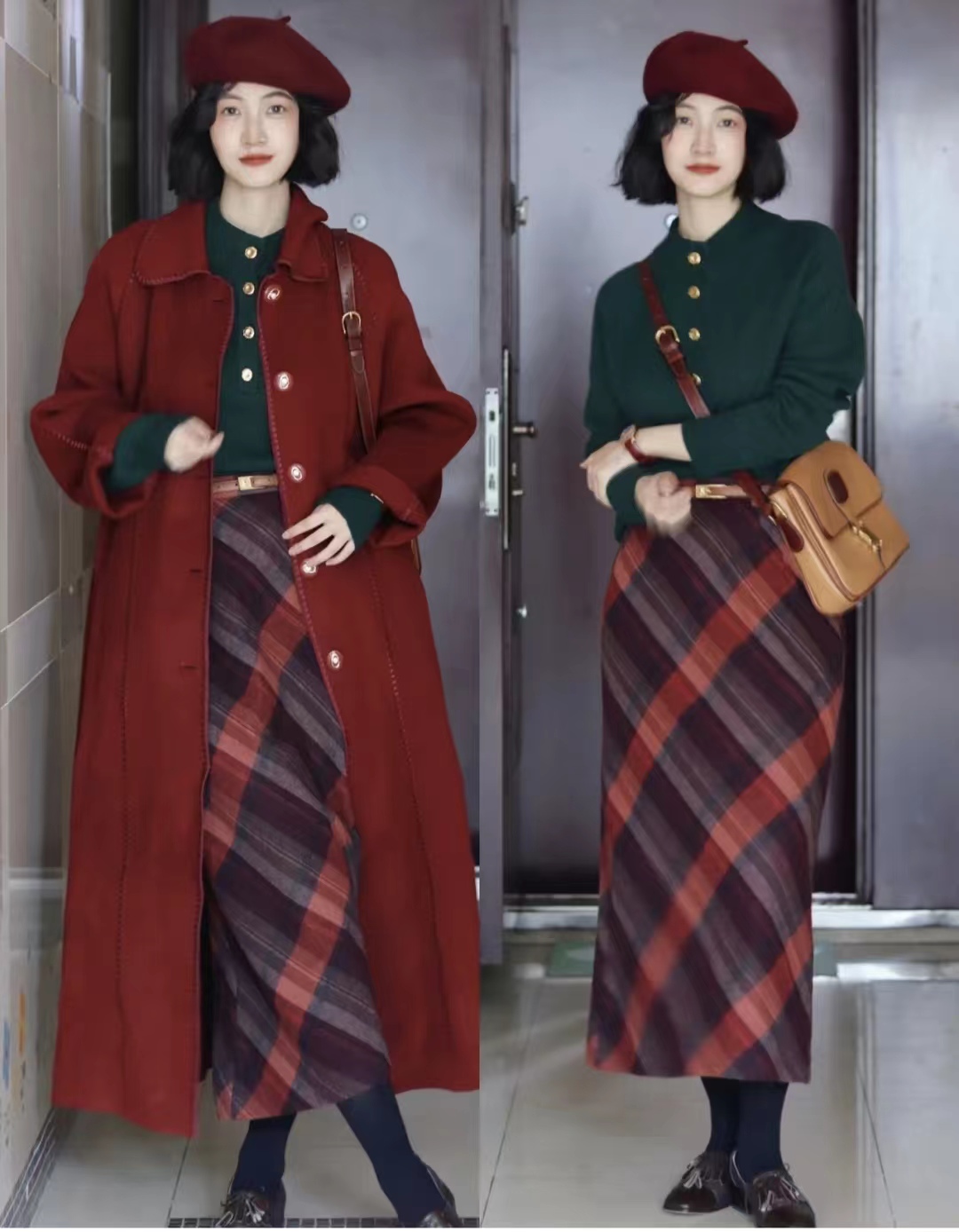 紅色開衫喜氣洋洋的,內搭白色襯衫+黑色半身裙,怎么感覺文靜又俏皮,這套還挺適合過年見長輩的,北方的姐妹們可以搭配一件黑色的羽絨外套兼顧保暖?