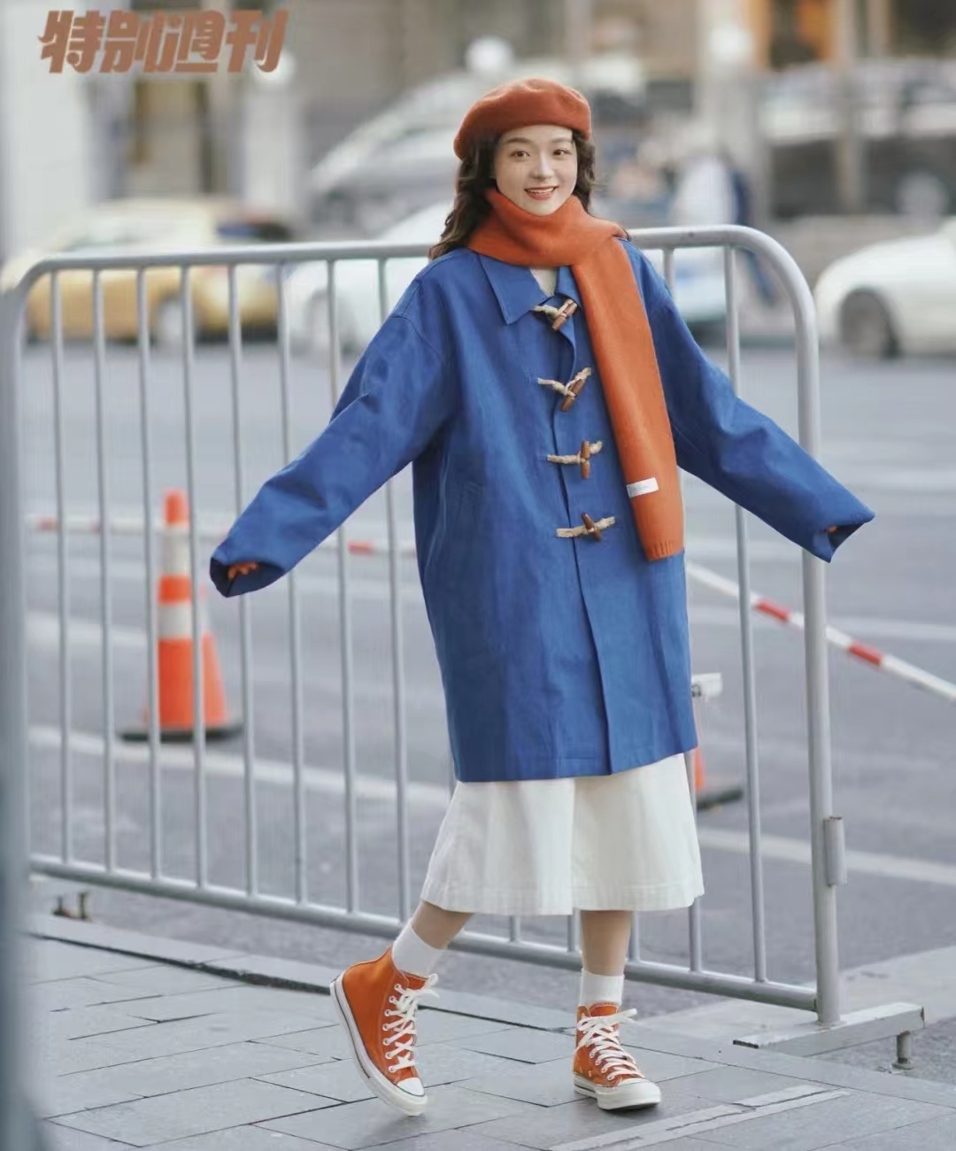 這身色系真的好絕,橙紅色搭配牛仔藍,衣服單品都用簡單的藍白,在帽子、手套、圍巾、鞋等配飾上呼應撞色,整個吸睛又元氣,日系色彩感滿滿~