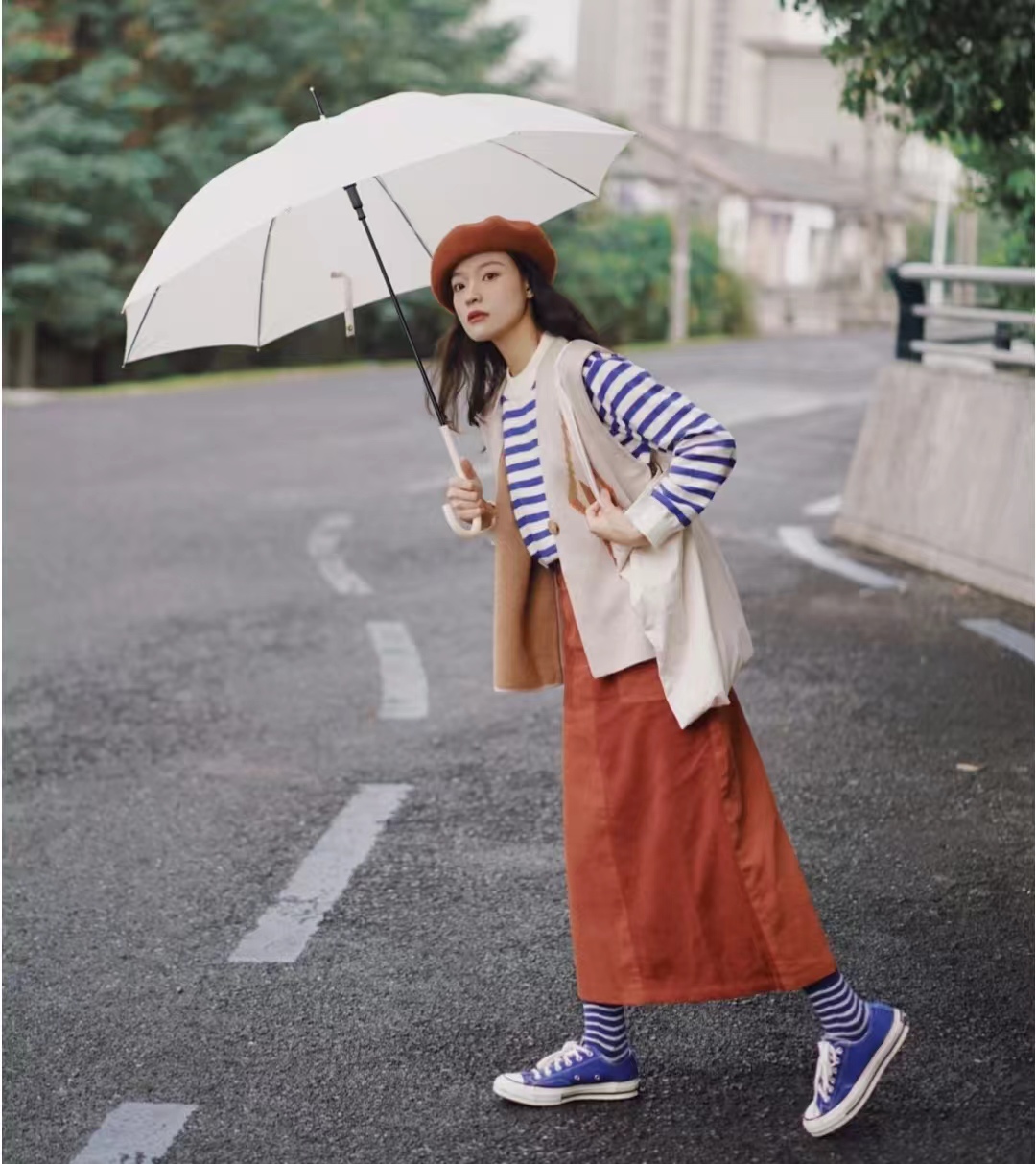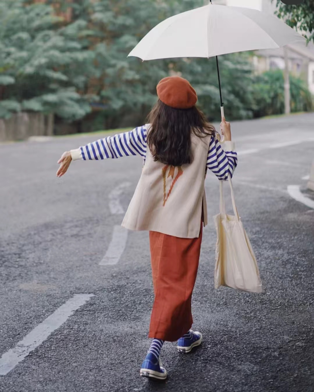 藍色條紋衫+米咖色馬甲+橘紅色燈芯絨半裙,紅藍撞色超級吸睛搶眼,紅帽子和裙子呼應,鞋、襪和條紋衫呼應,整體配色超級有日雜感,拍照都超級上鏡!