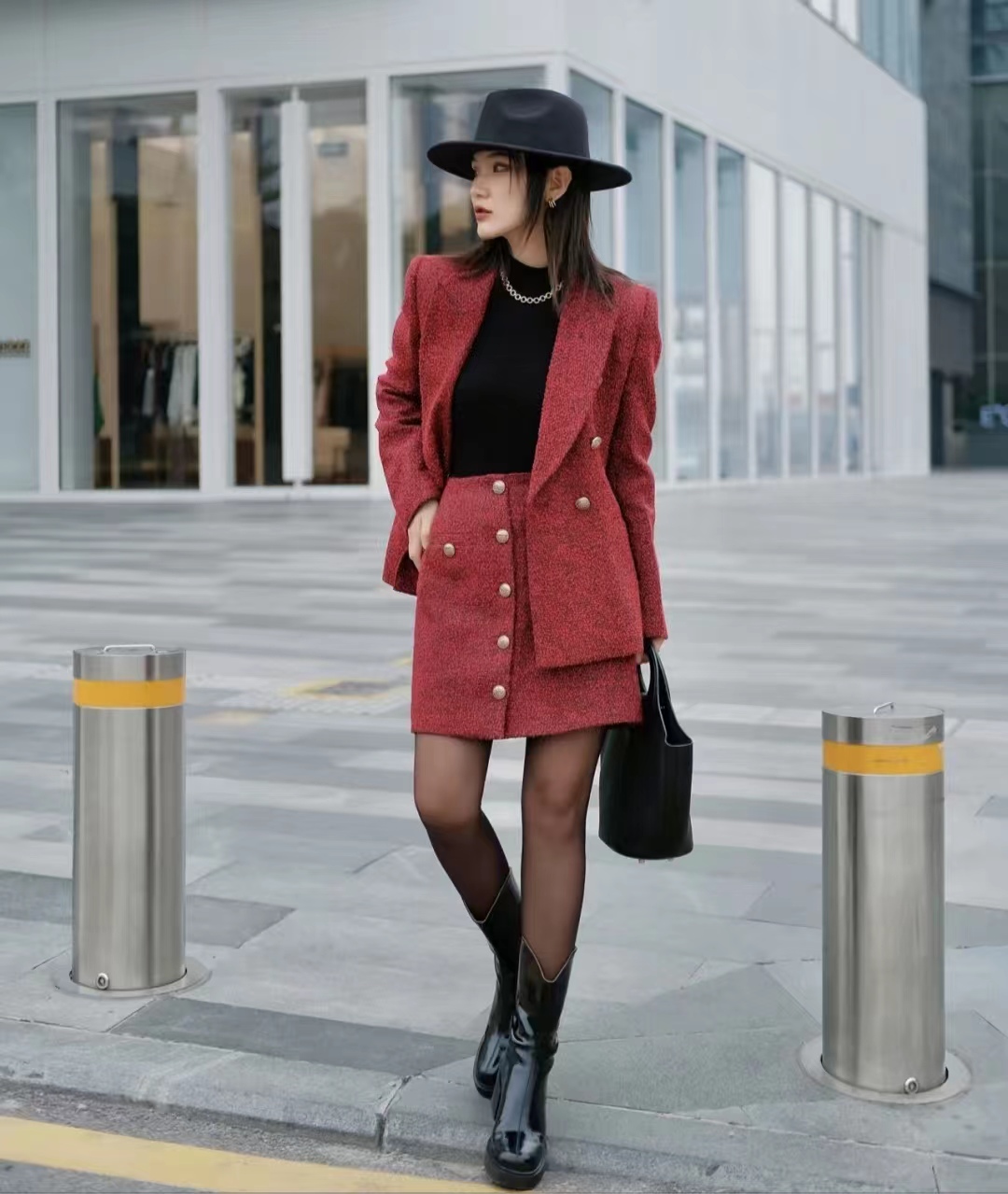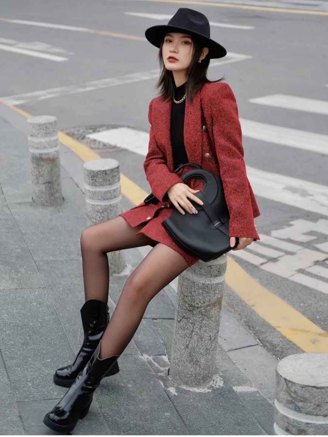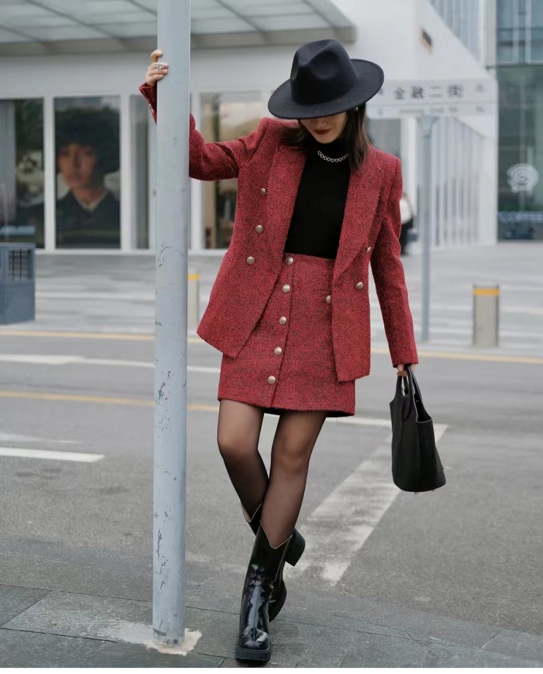 look2 紅色粗花呢西服套裙+黑色打底/黑靴