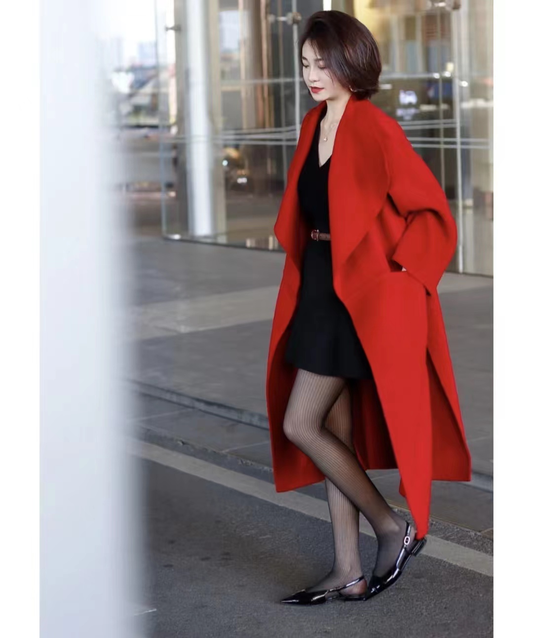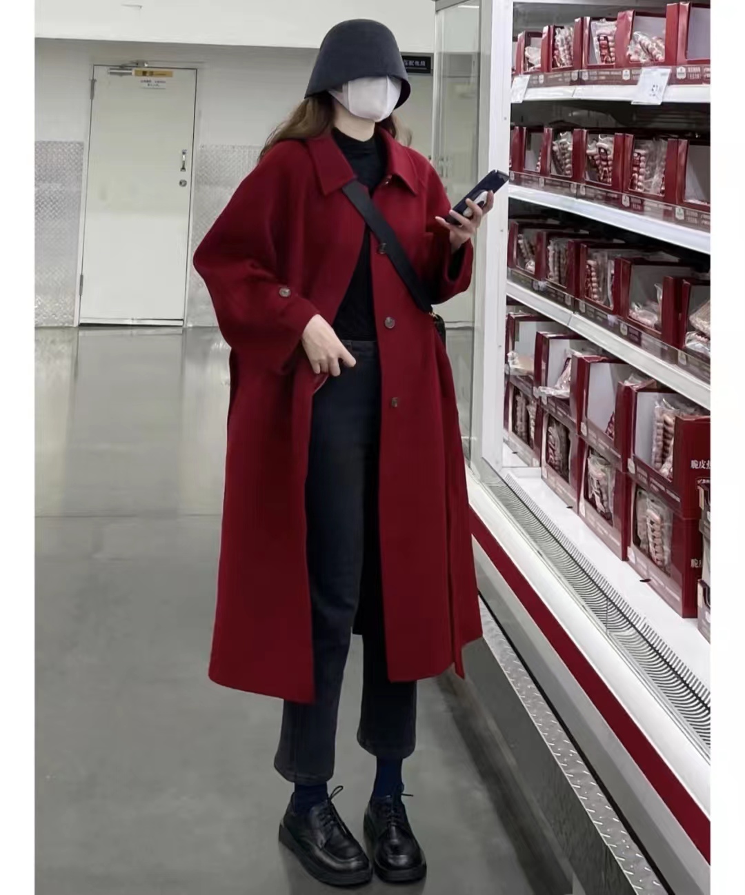 look1 米白色大衣+紅色打底/黑色微喇褲