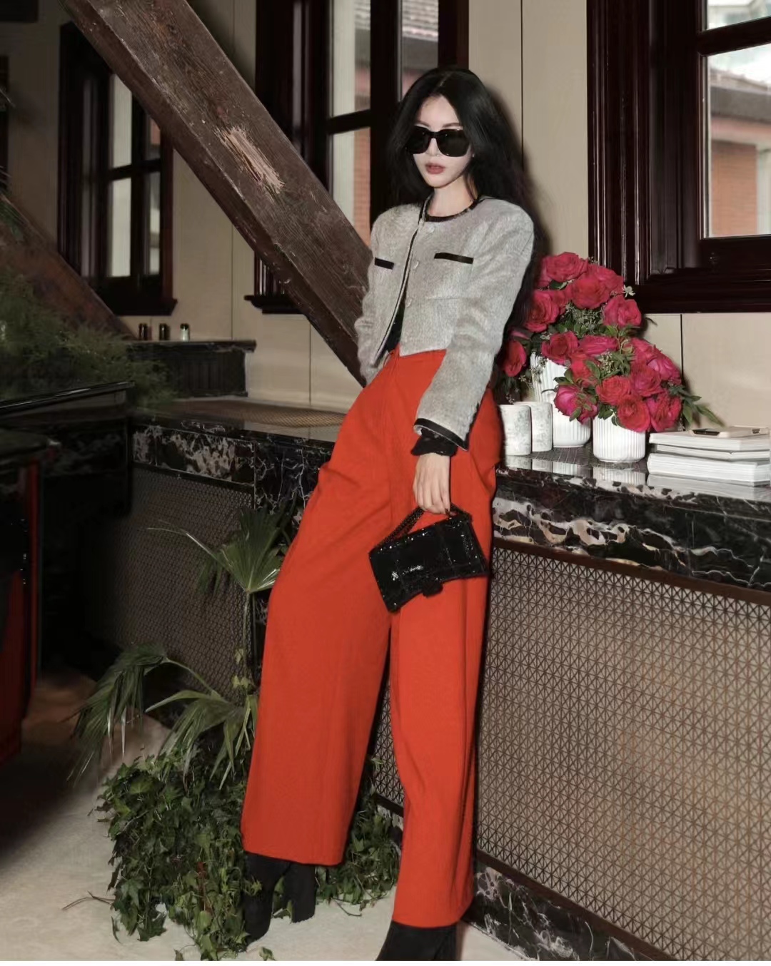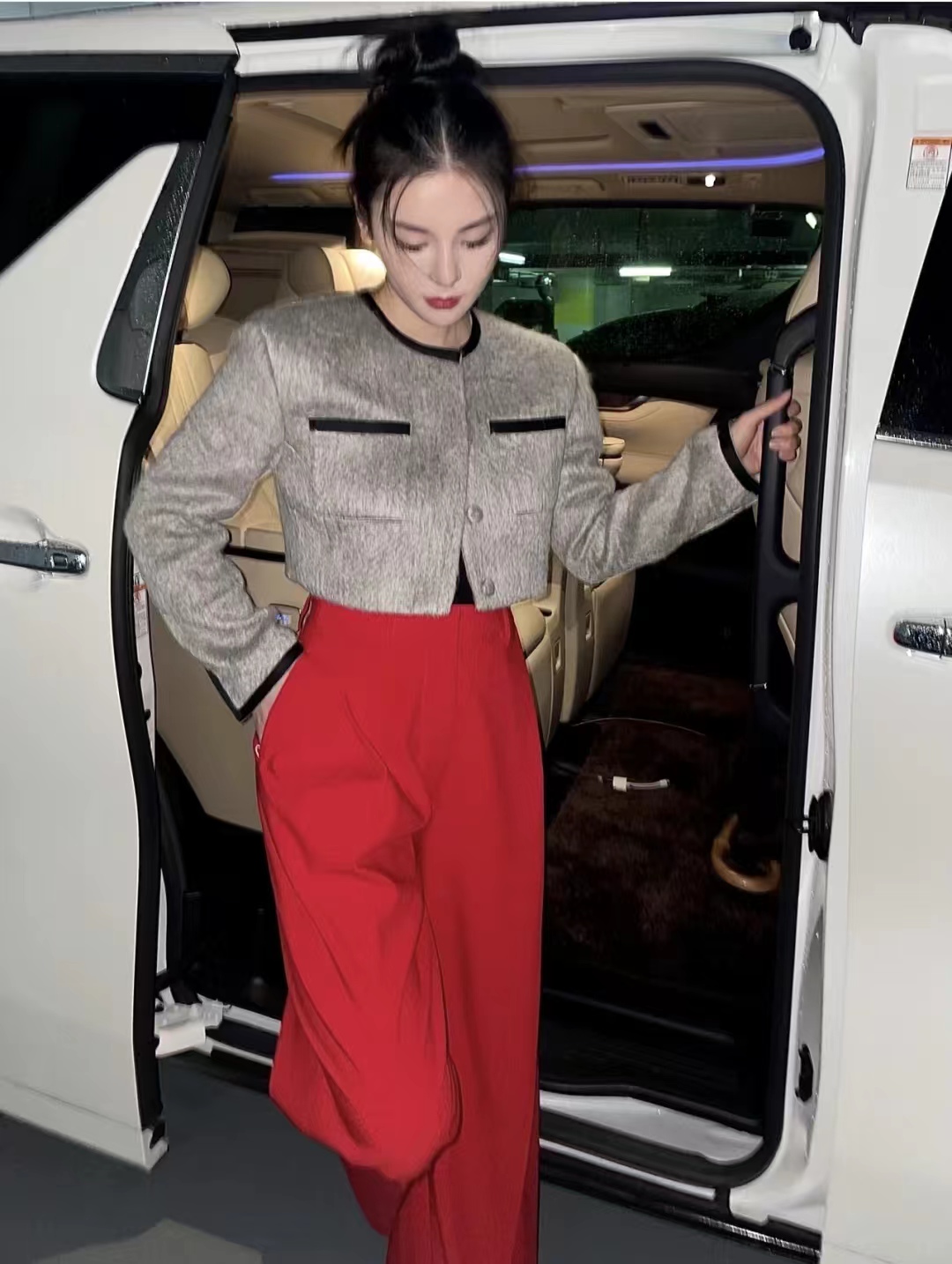 紅色壓褶闊腿褲搭配“灰色羊毛短外套” 高級且和諧,高飽和的紅色搭配低調的淺灰色,不僅讓紅色變得日常且人人都可駕馭!