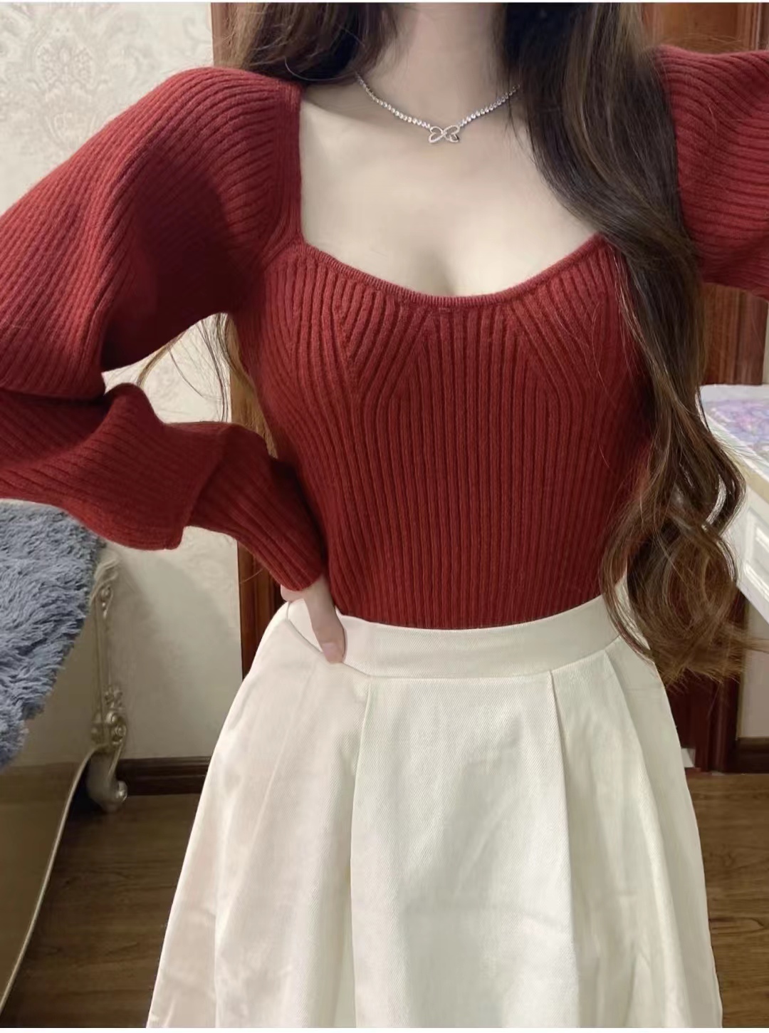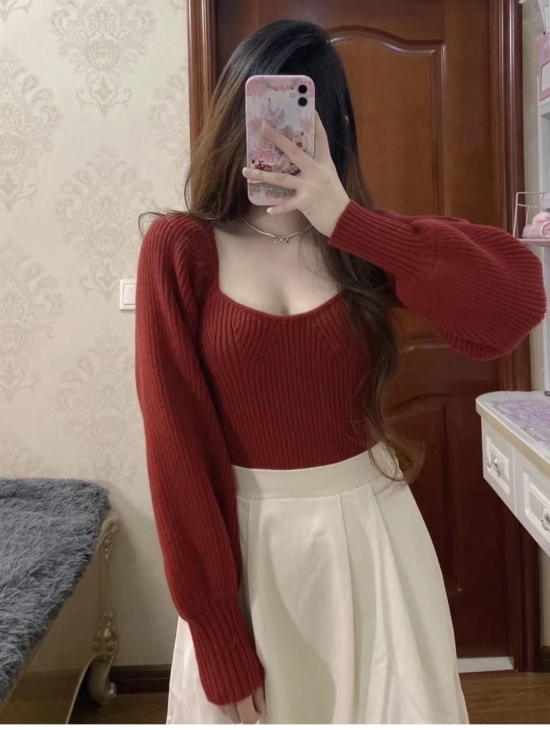 這套真的好顯氣質+溫柔優雅,泡泡袖紅色針織衫單穿或者當內搭都可,搭配奶白色傘裙很港風,涂個大紅唇+卷個大波浪絕了?