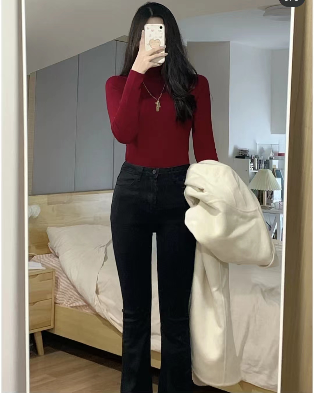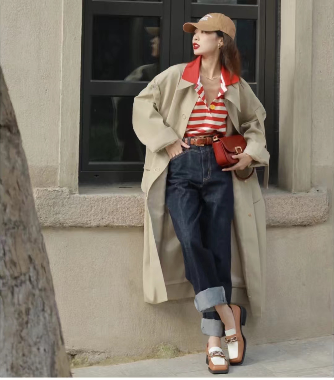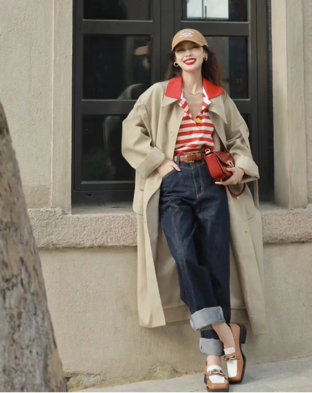 米色大衣上身溫溫柔柔的很氣質,內搭紅色修身+黑色微喇牛仔褲和黑色皮鞋,紅色的小包和內搭呼應,并且給這套點睛+顯高級?
