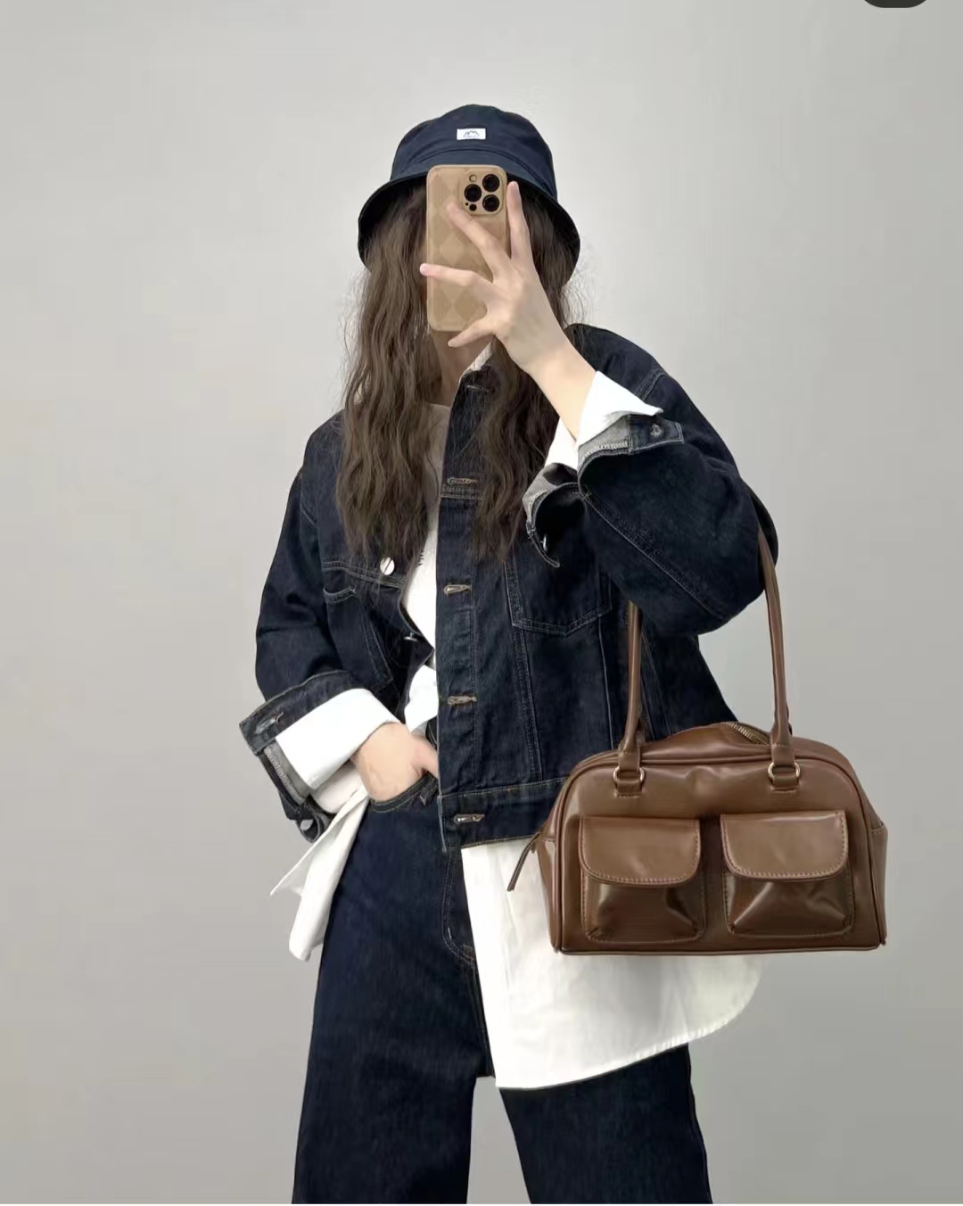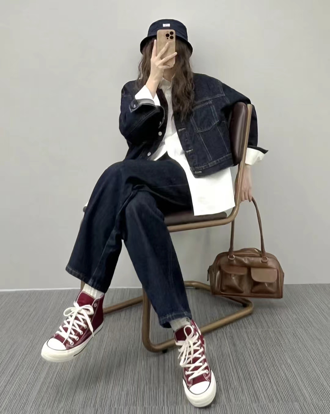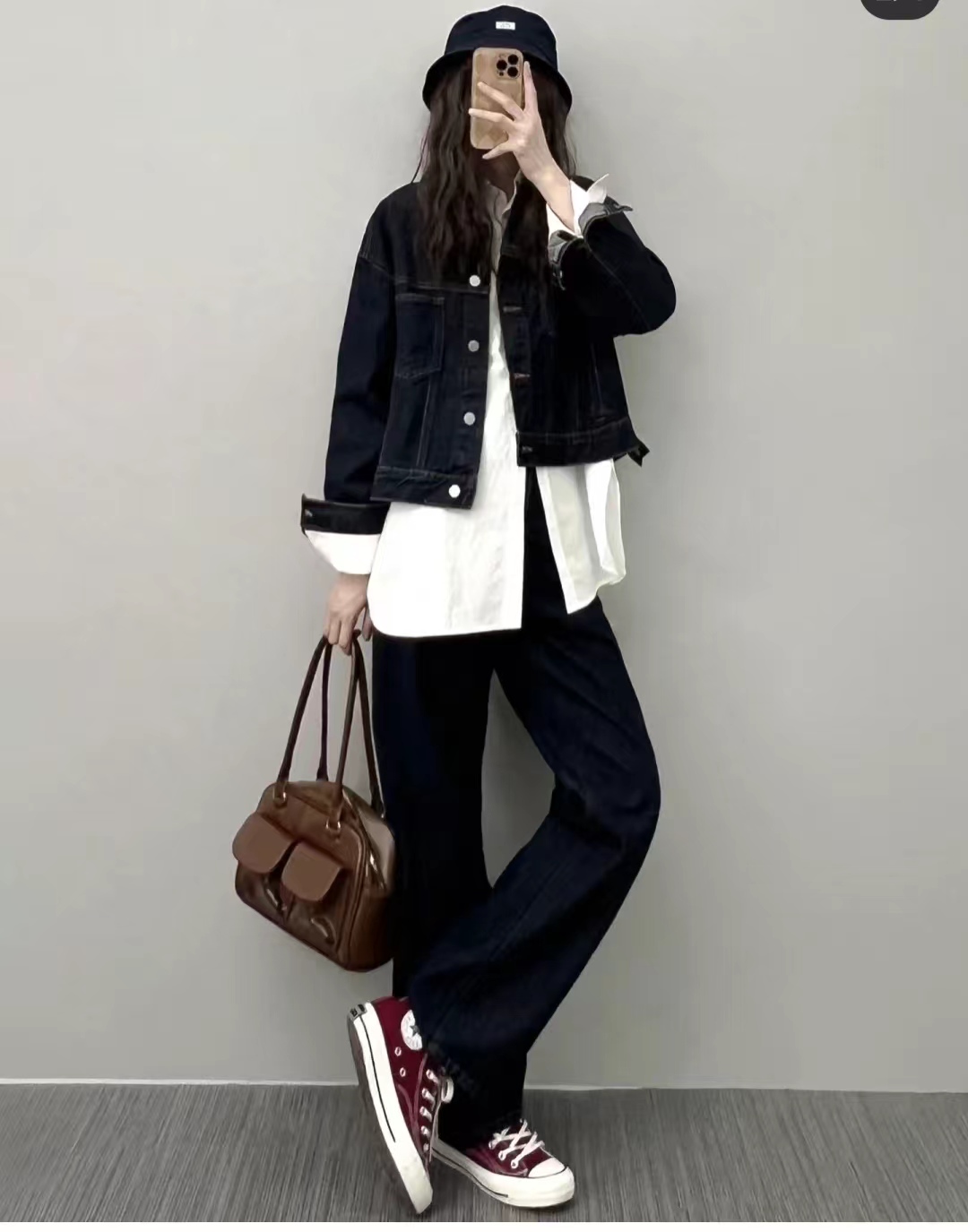 look2 白色襯衫+深藍色牛仔套裝/紅色包包點綴