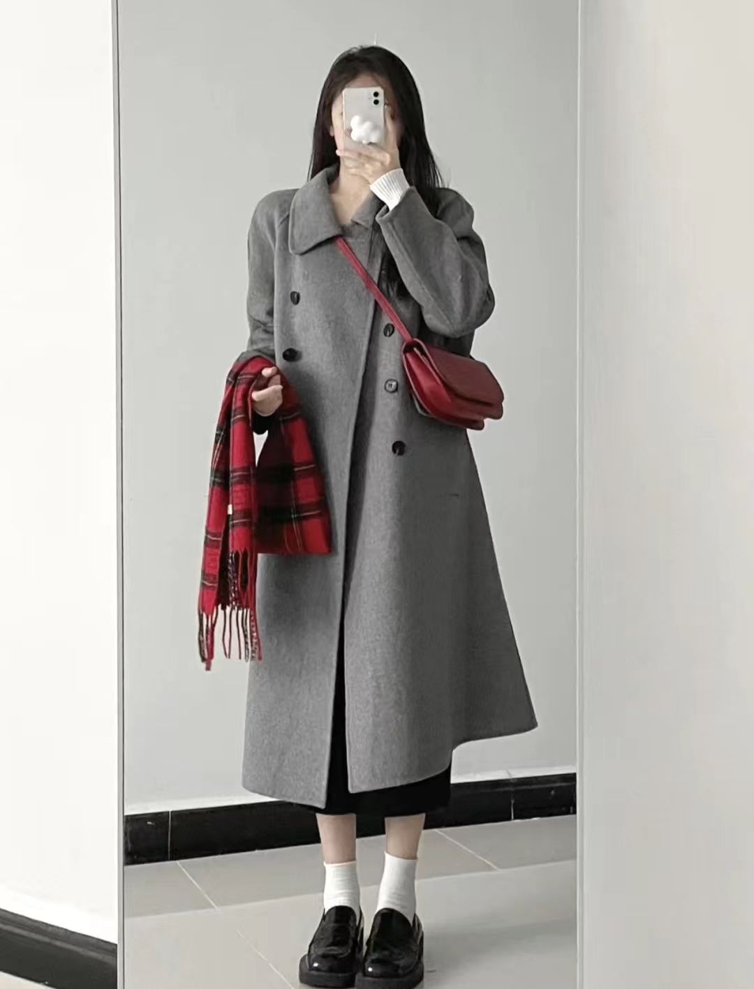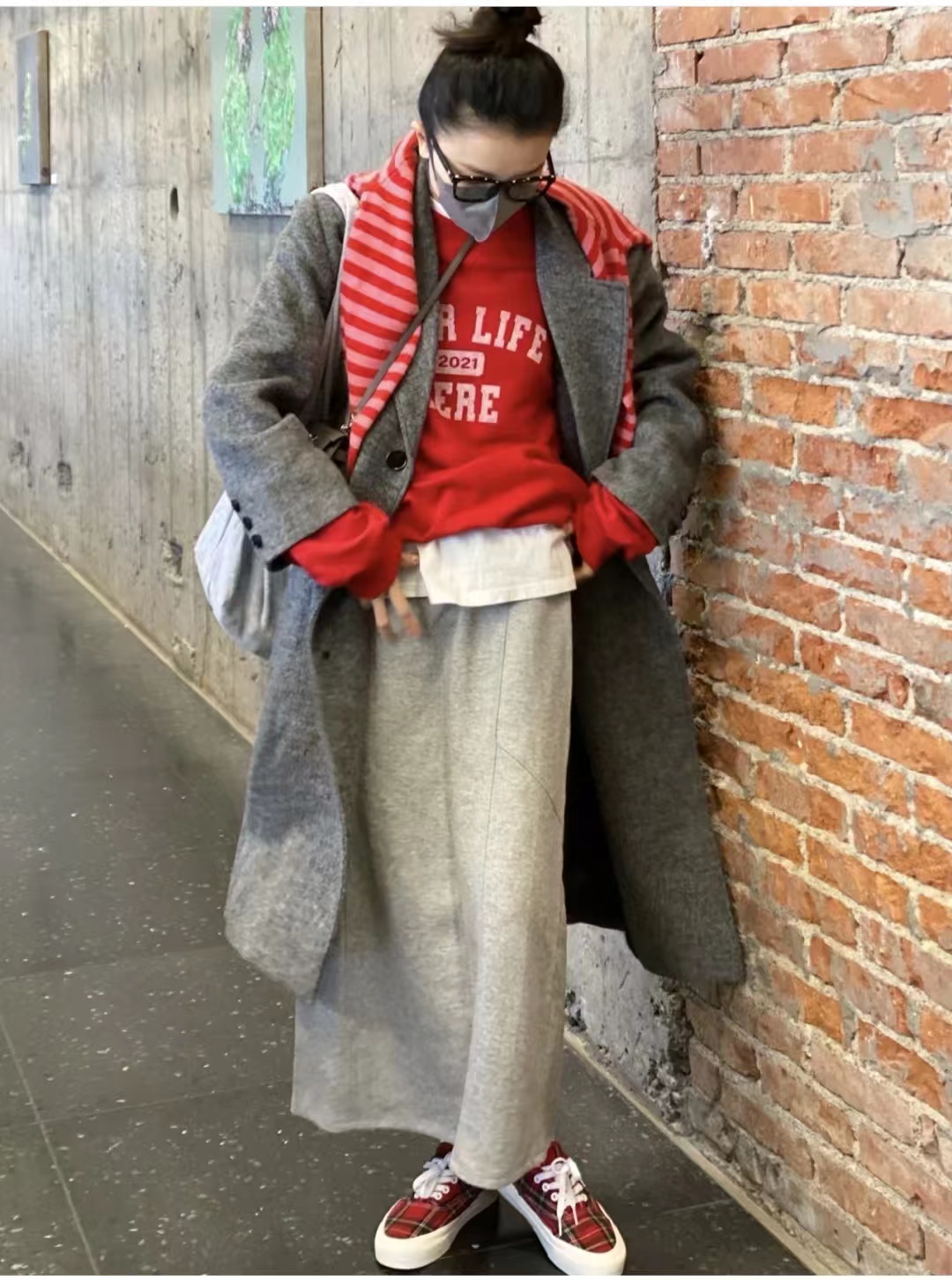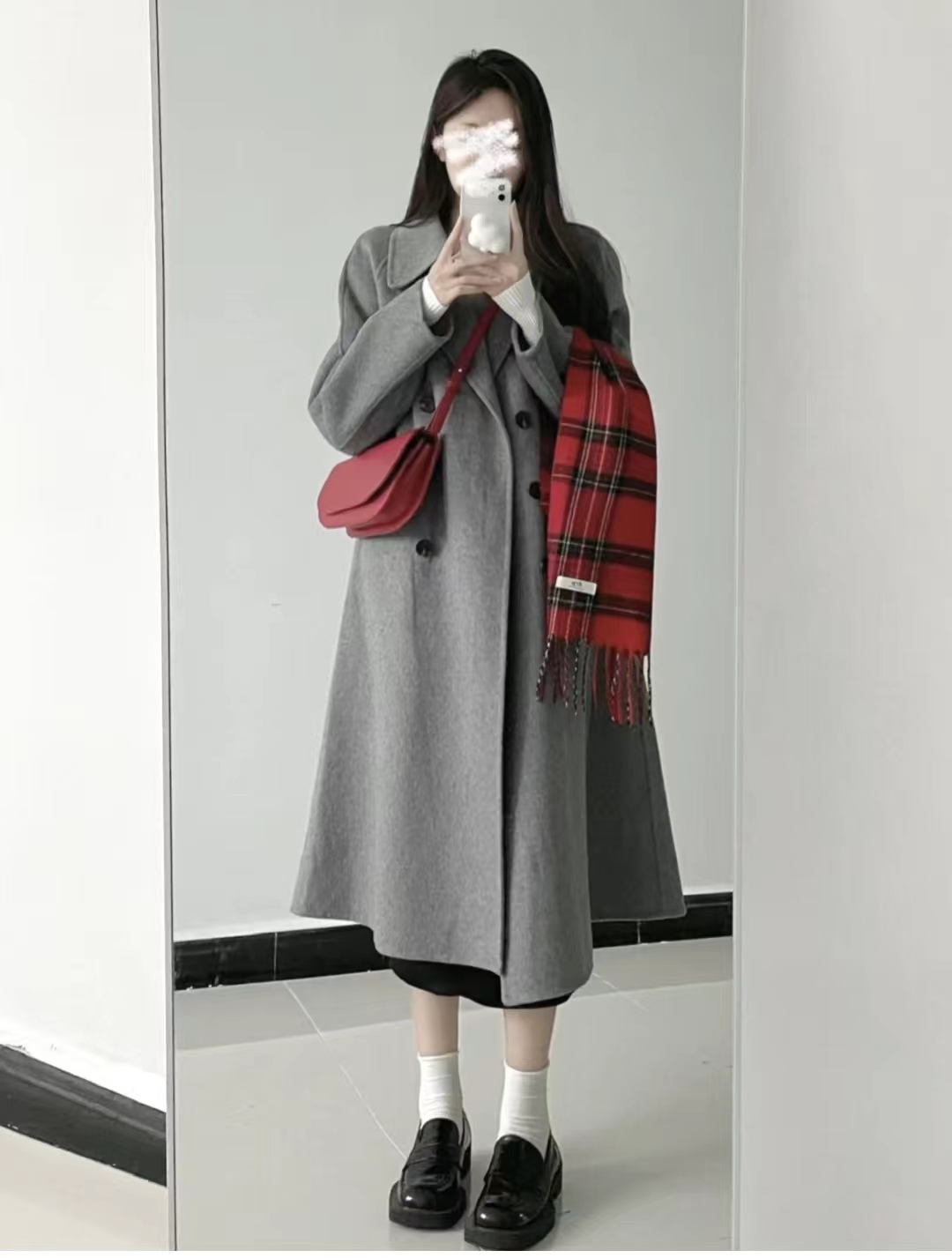 沒想到灰色跟紅色這么配,而且很特別,灰色大衣有種清冷氣質的感覺,但是搭紅色圍巾就感覺暖暖的?
