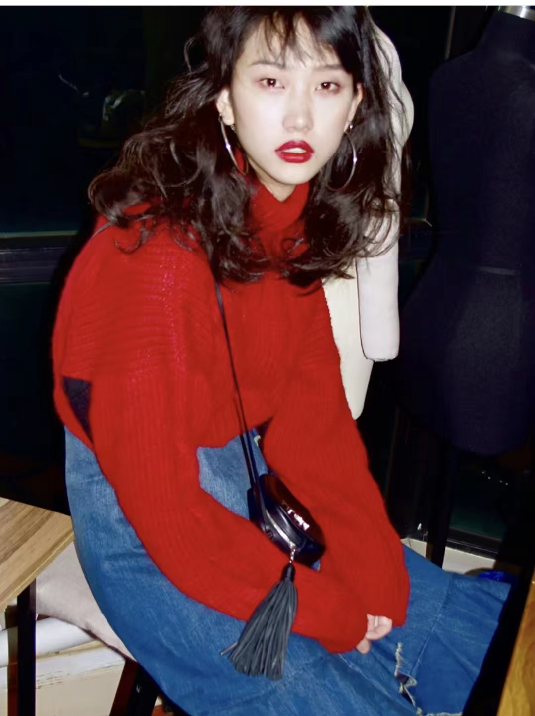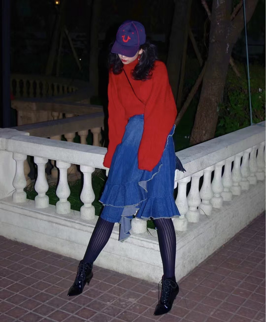 除了全身total紅的造型外,藍色也適合和紅色搭配,顏色既跳眼又時髦,毛衣和牛仔的質料也一點都不會奇怪,高腰毛衣+高腰裙可以把比例凸顯的超級好?
