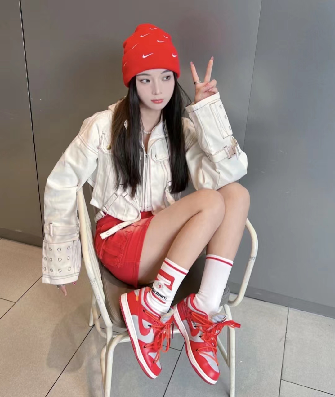 白紅搭配真的太吸睛啦,而且非常有節日氛圍。設計感白色工裝外套還帶點機能感,牛仔做舊短裙直接拉長腿部比例,超級顯高顯瘦,紅色滿印針織帽和裙子球鞋顏色呼應,非常具有整體感~