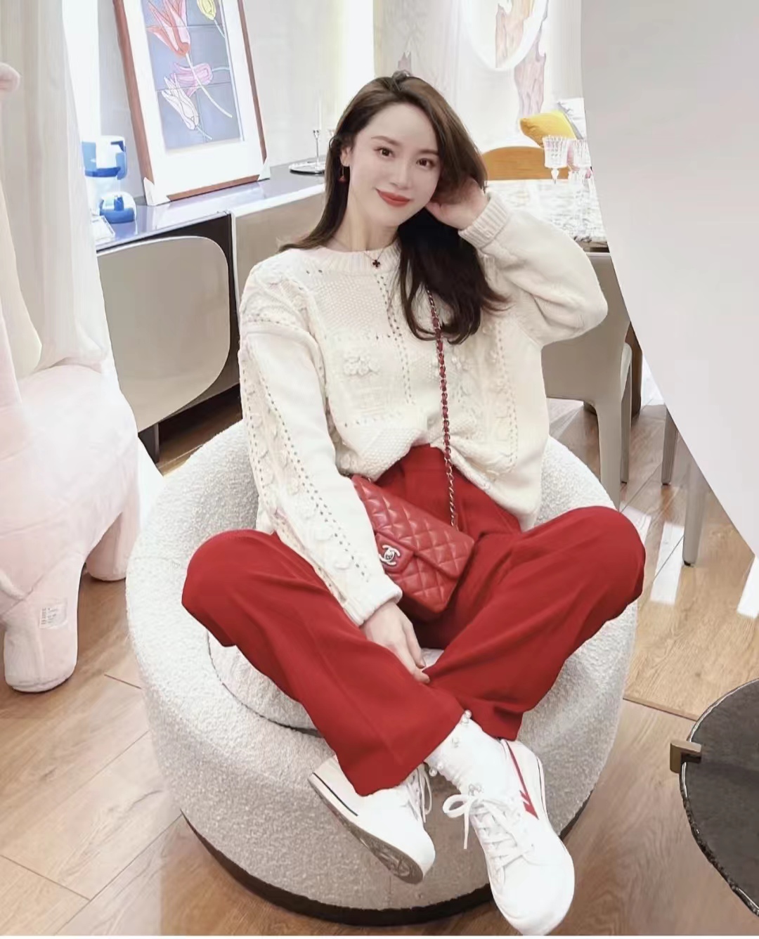 米白色鉤花山羊絨溫柔又清純,如果紅上衣比較難駕馭,可以嘗試下紅褲子,距離臉部較遠,可以稍稍減低顏色帶來的視覺沖擊感,紅色褲子提亮整體色彩,為穿搭增添一份新鮮感,更讓人眼前一亮?