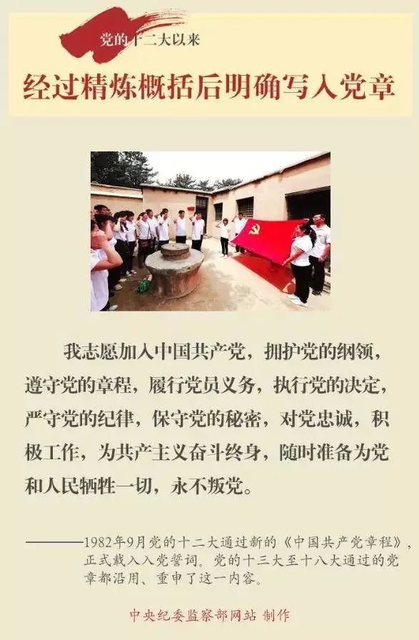 ——1982年9月黨的十二大通過新的《中國共產黨章程》,正式將入黨誓詞載入。自此,一直到黨的十九大通過的《中國共產黨章程(修正案)》,都沿用了這一誓詞。