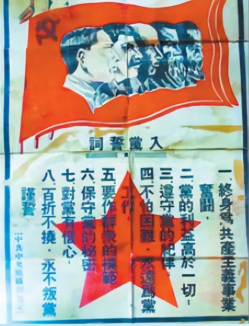 我自愿立誓參加共產黨,永遠跟著共產黨毛主席走,一心一意為人民服務, 個人利益服從黨的利益, 堅決執行黨的決議,遵守黨的紀律,保守黨的秘密,遵守民主政府的法令、群眾的決議,在任何情況下不動搖,不妥協,不怕困難與犧牲,為新民主主義和共產主義的實現而奮斗到底。
