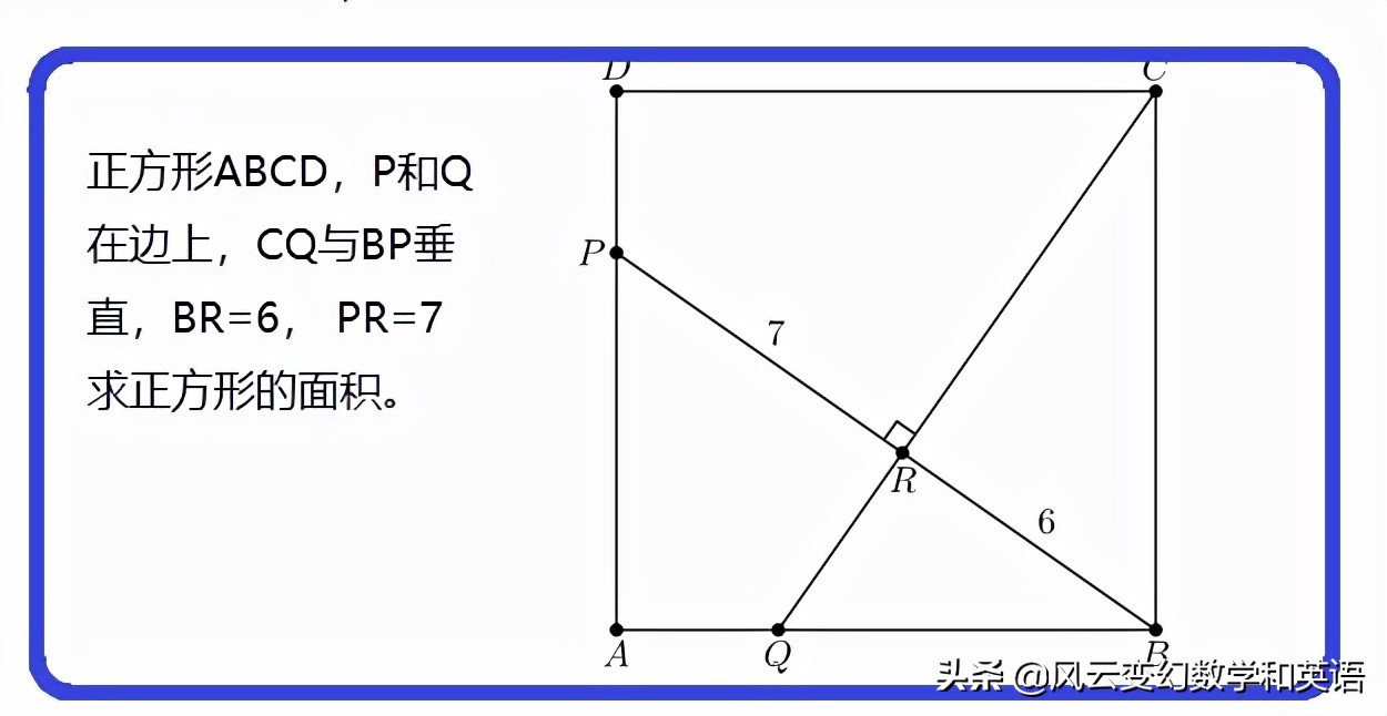導讀求解正方形的面積在正方形ABCD中,點P和Q分別位于AD和AB上。線段BP線段CQ垂直角相交R點,BR = 6, PR = 7。這個正方形的面積是多少?解法1注意三角形APB 全等于三角形BQC。然