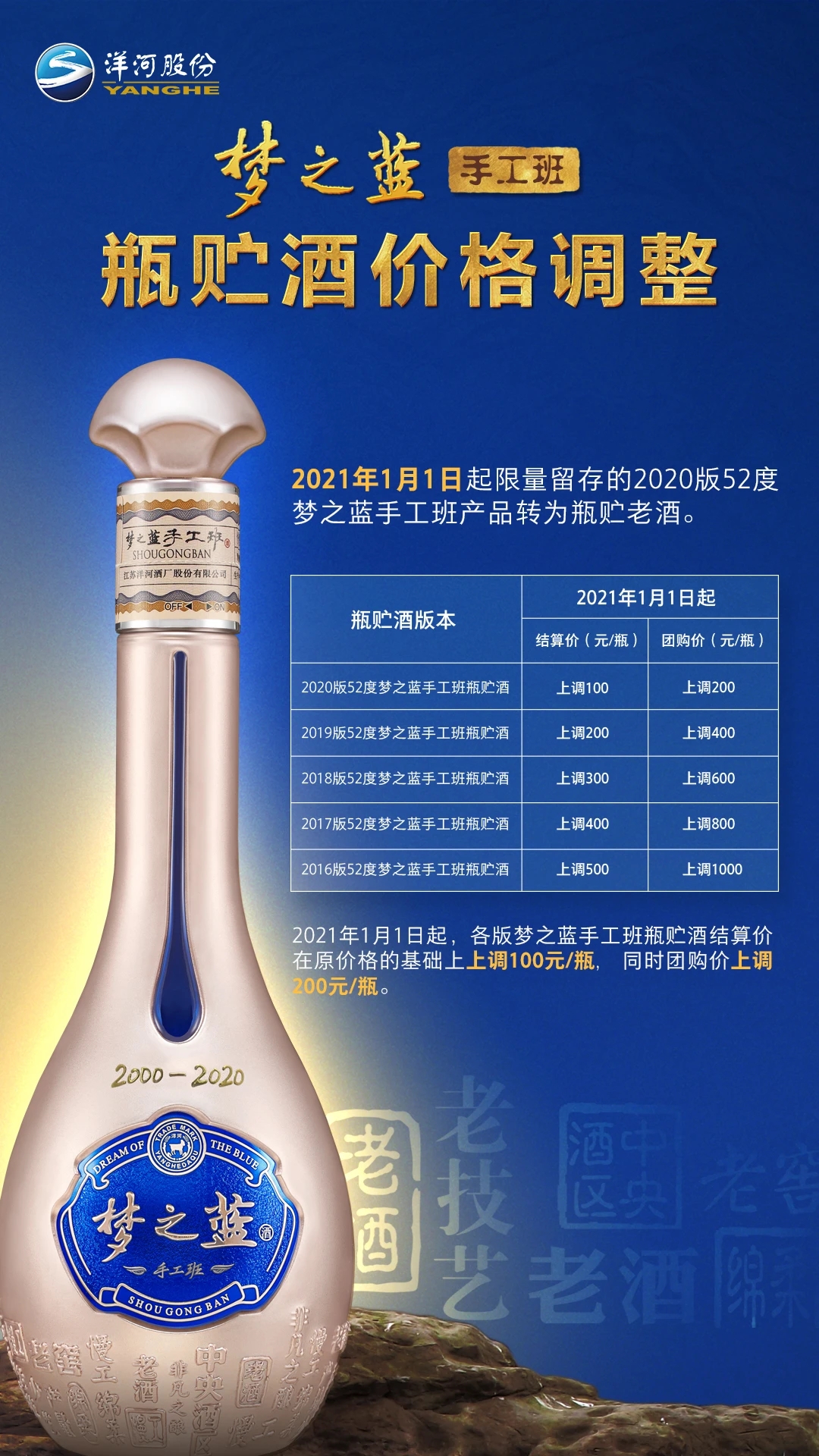 新京報訊(記者 鄭明珠)11月13日,洋河夢之藍官方微信公眾號發布消息稱,2021年1月1日起,限量留存的2020版52度夢之藍手工班產品轉為瓶貯老酒。各版夢之藍手工班瓶貯酒結算價在原價格的基礎上上調100元/瓶,同時團購價上調200元/瓶。