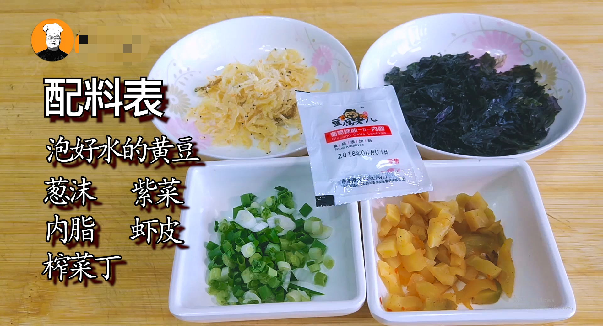 泡好水的黃豆、蔥末、紫菜、內脂、蝦皮、榨菜丁