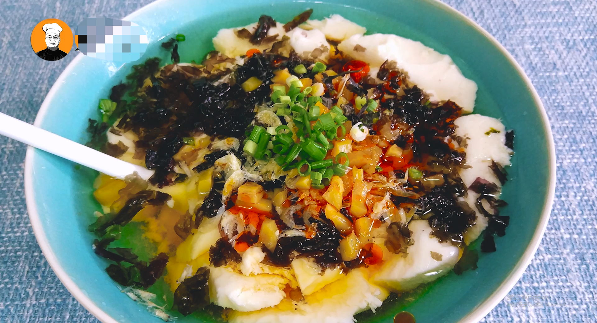 7、再把豆腐腦盛入碗中,再放入紫菜、蝦皮、榨菜丁、生抽、芝麻油、辣油,最后再撒上小蔥。這樣一碗又嫩又滑的豆腐腦就做好了